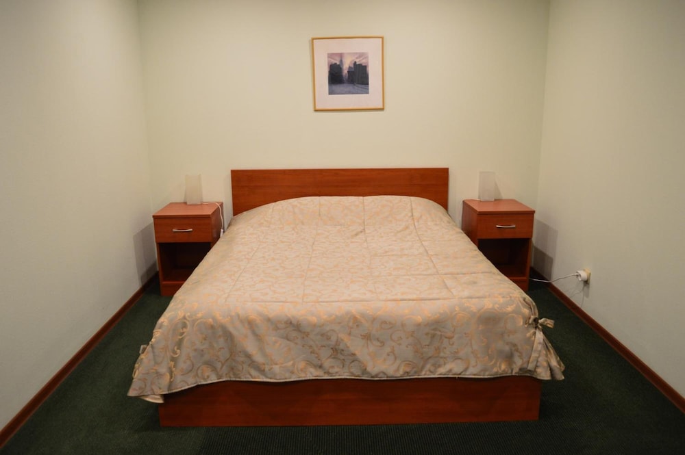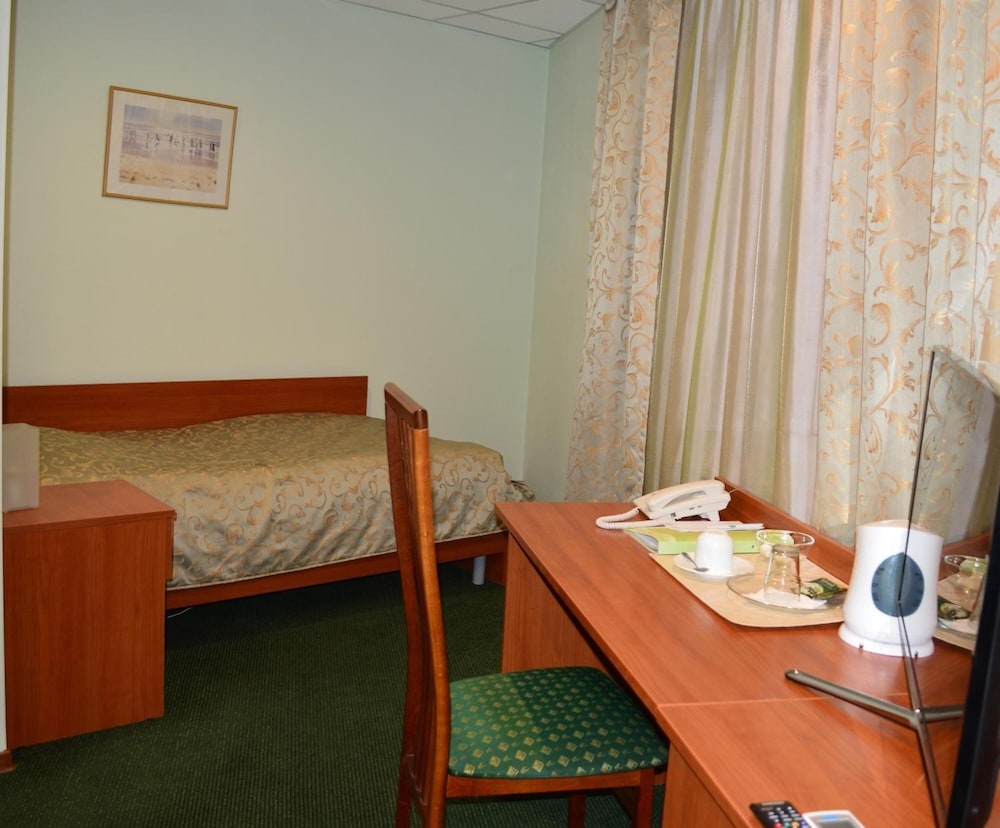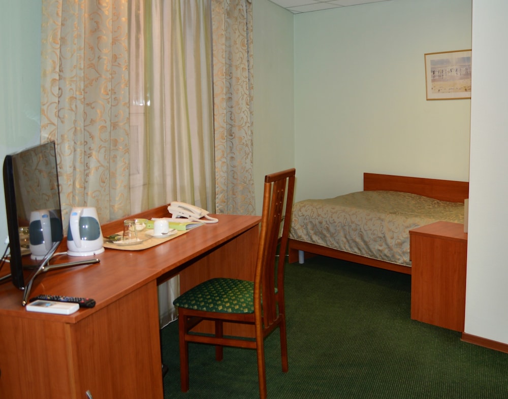 Гостиница задней частью выходит на оптико-механический завод. Объект режимный и поэтому справа и слева от гостиницы всё в колючей проволке. Окна в номерах выходящих на завод закрашены и не открываются. По сути я жил в номере (204) без окна. Как ведомственная гостиница при заводе, для командированных на этот завод, она не плоха. Но от трехзвездочной гостиницы я ожидал большего, хотя бы окна в номере. Периодически возникла неприятный запах в туалете. В самом номере всё прилично, чисто, мебель новая.