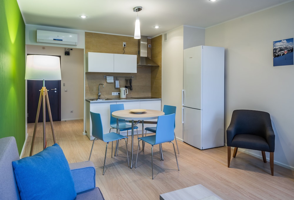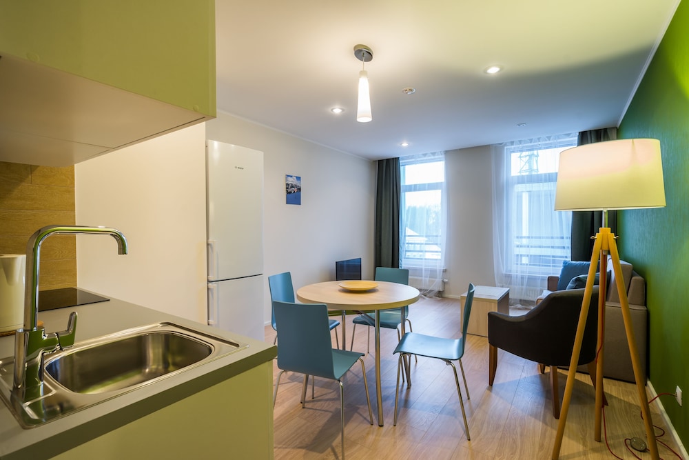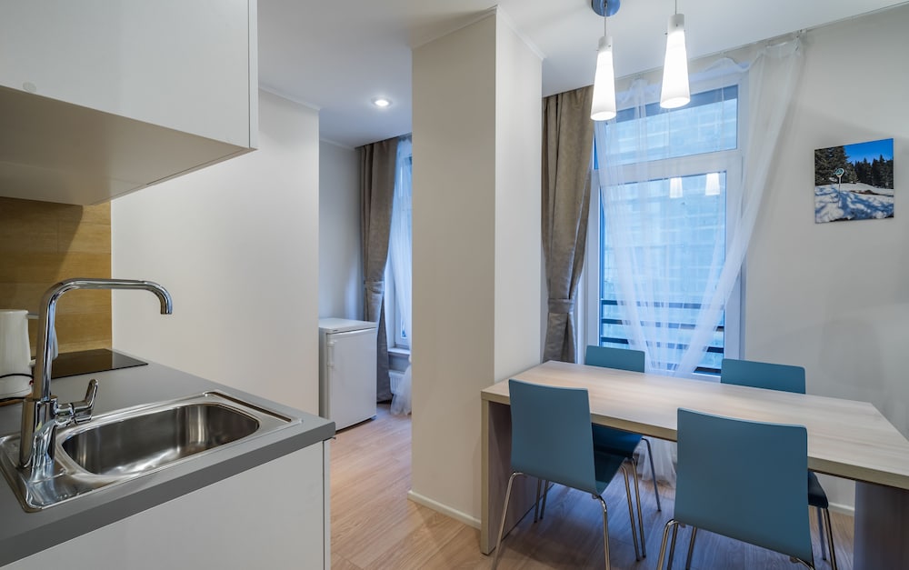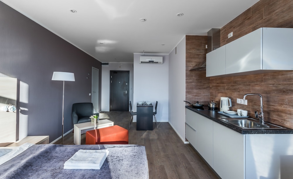 Оборудование апартаментов очень понравилось - посудомоечная машина, кондиционер в коридоре и вытяжка на кухне, варочная панель, посуда, стиральная машина, сушилка, утюг и гладильная доска. Можно жить долго и комфортно. Легкое заселение, комфортная коммуникация. Уборка за доплату, но это резонно при таком ценнике . Инфраструктура рядом, супермаркет-все шикарно. Менеджменту отеля я бы посоветовала что-то придумать, чтобы убрать запах пыли в номерах и в коридоре -вроде все чисто аккуратно, а раздражает.