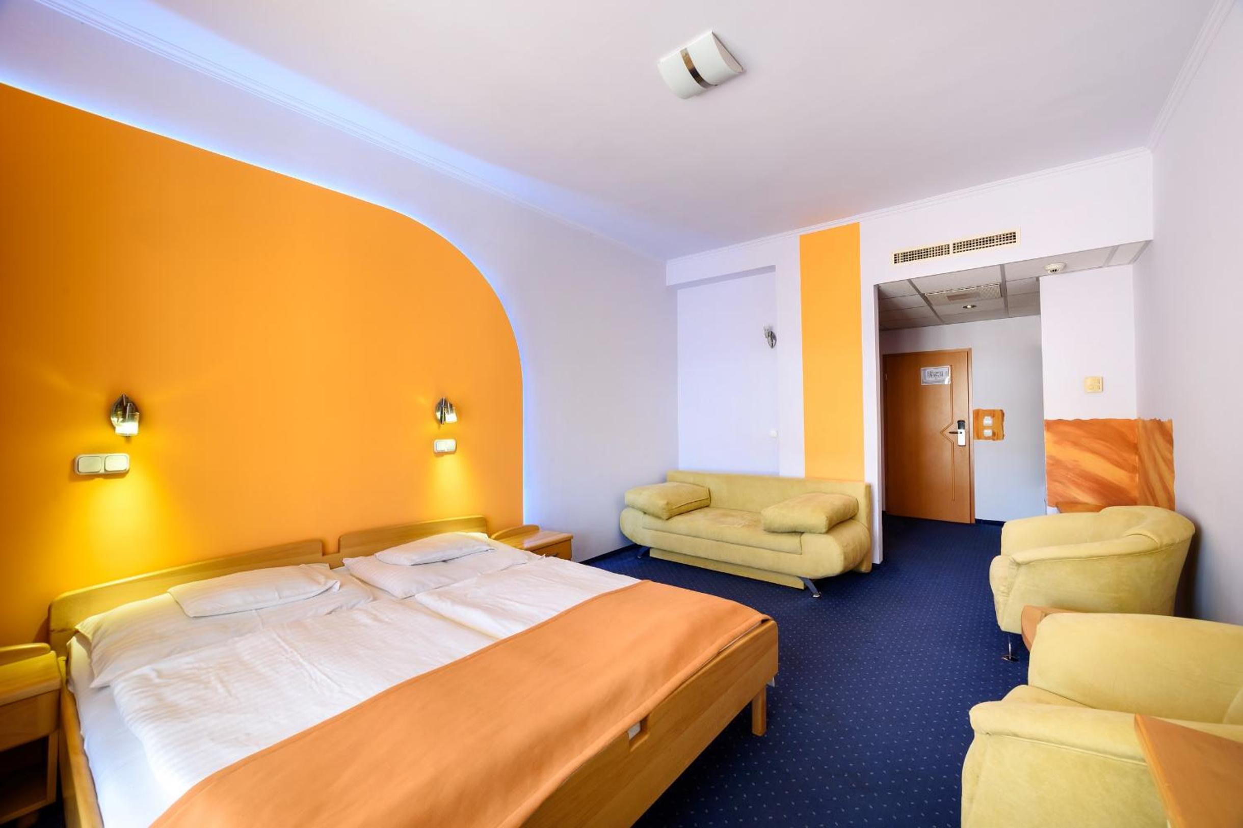 Hotel Négy Évszak offers elegant rooms equipped with modern amenities like a minibar, safe, and flat-screen TV. Some rooms even feature a cozy seating area and a balcony, ensuring a comfortable stay for every guest.