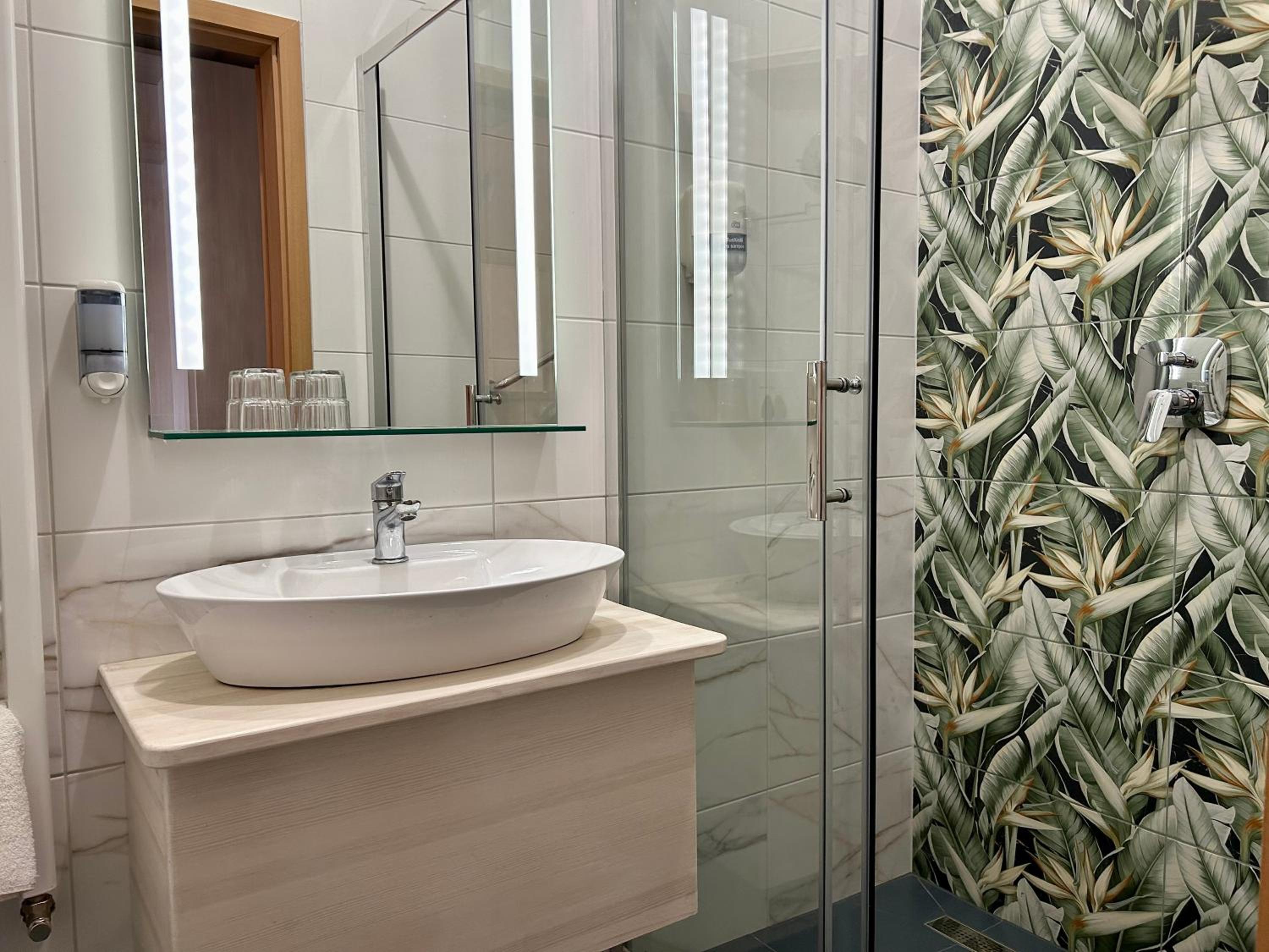 A mosdó kialakítása a tükör előtt.