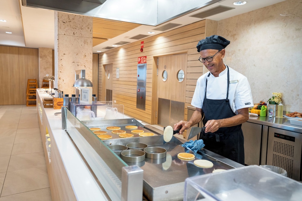 The breakfast, a buffet had anything you can dream off, traditional Spanish, cooked English, cold meats and cheeses, Croissants and Pastries (ohhh the “ensaimada” wow! lots of cereals, fresh fruit, yoghurts, cava … etc. The list goes on and there was always someone at the “plancha to make fresh pancakes, omelettes and fried eggs on demand. The buffet at dinner time was also out of this world. Lots of salads, cheeses, “jamón and other cold meats”, different prepared veg and potatoes everyday and lots of fish or meat dishes. At the plancha station, the cooks would griddle your choice of 2 fish or/and 2 meats and cooked as you like them.