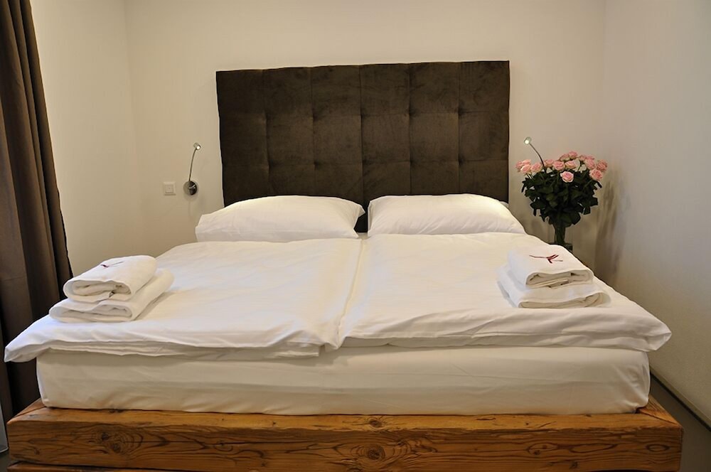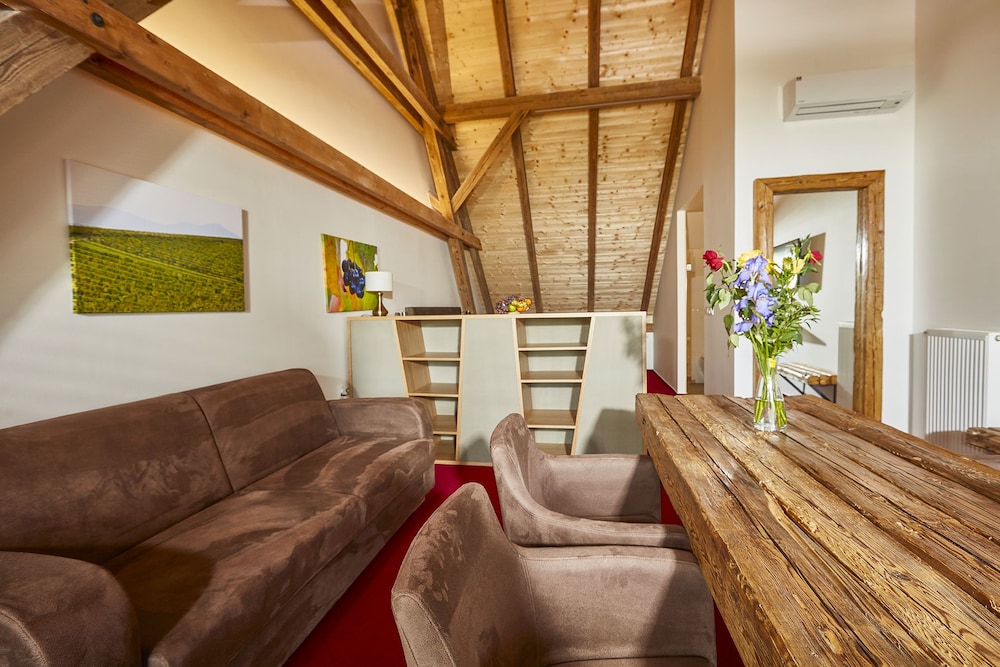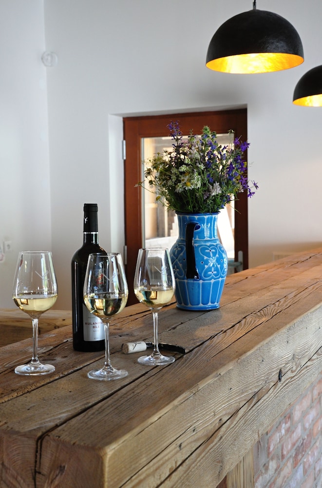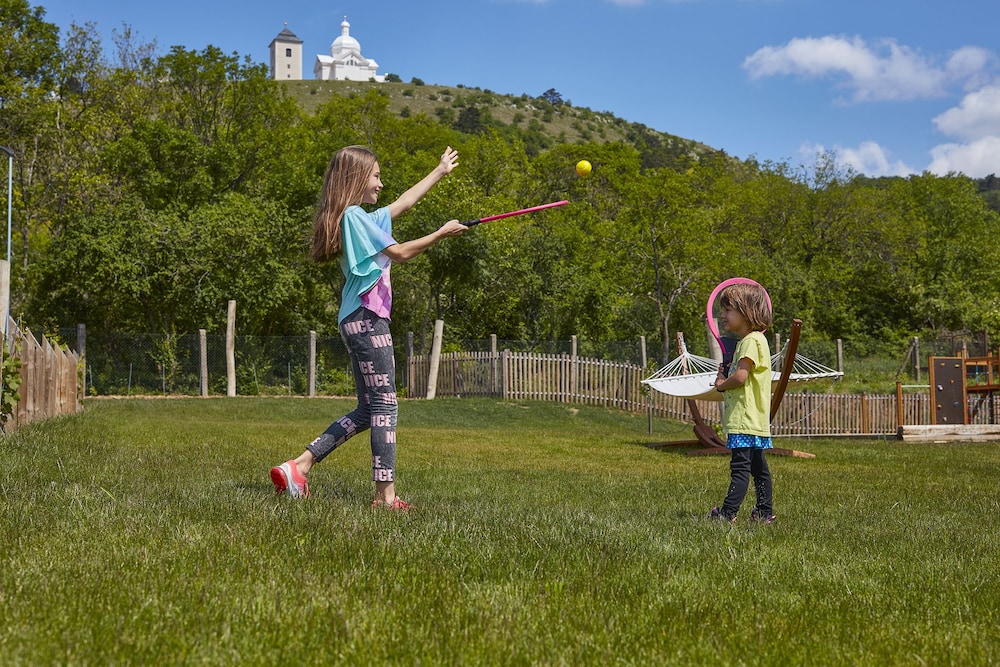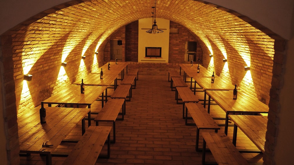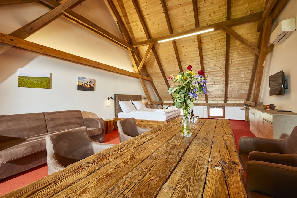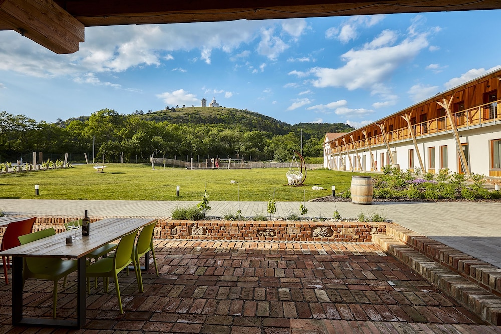 This is a modern hotel located adjacent to a winery and within an easy walk to the Mikulov city center. The rooms are spacious, comfortable, and decorated with heavy wood furniture and exposed beam ceilings. There was a complimentary bottle of wine provided upon check-in and the included breakfast buffet was delicious. The dinner in the attached restaurant was delicious - don't pass up the desserts! Nice grounds for families.