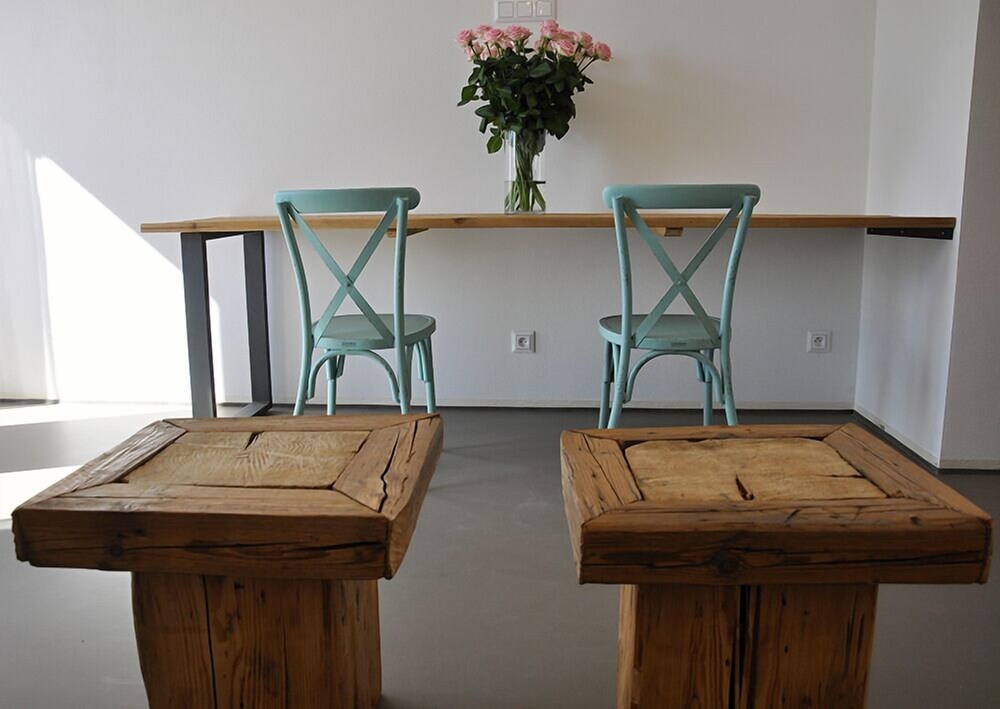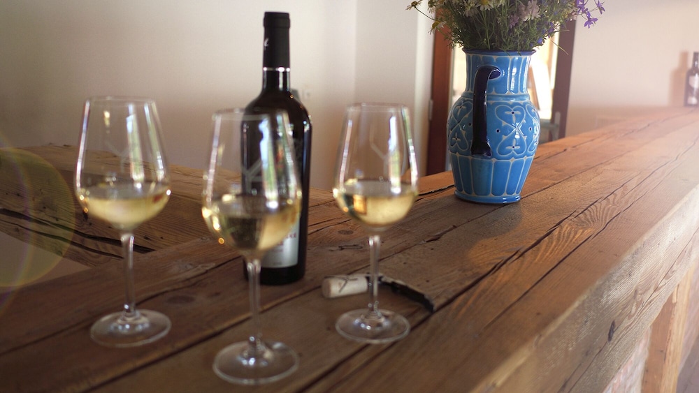 The room with high ceiling and lots of massive wood is beautiful, comfortable and spacious. The wine bath we definitely recommend too as well as the kitchen, which had also a good vegan option, and of course the local vine!