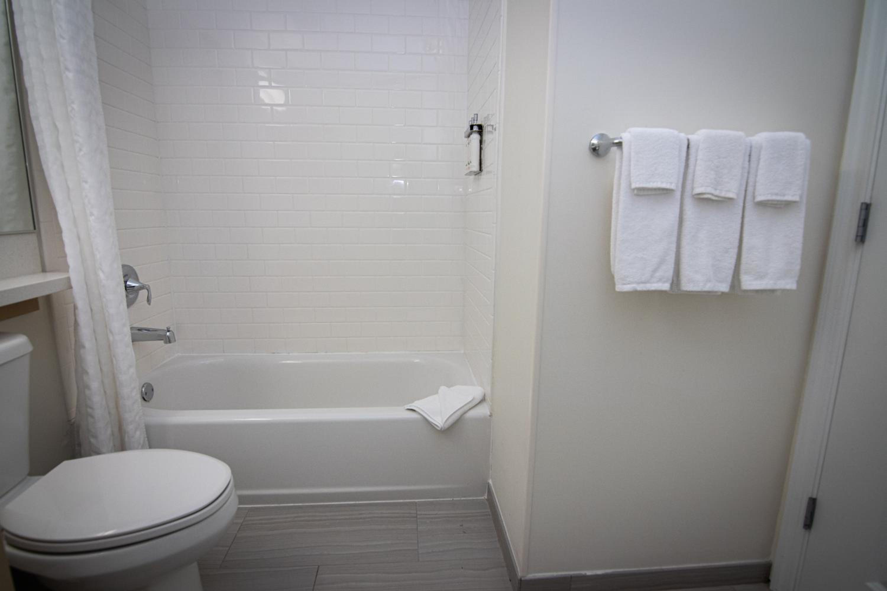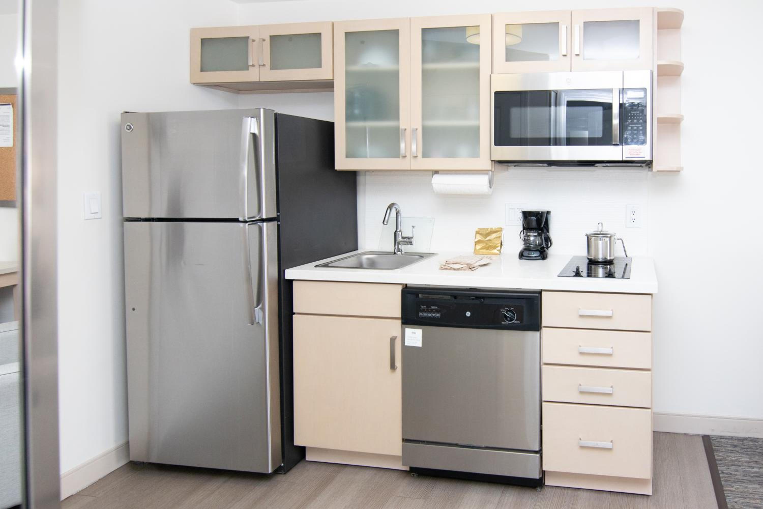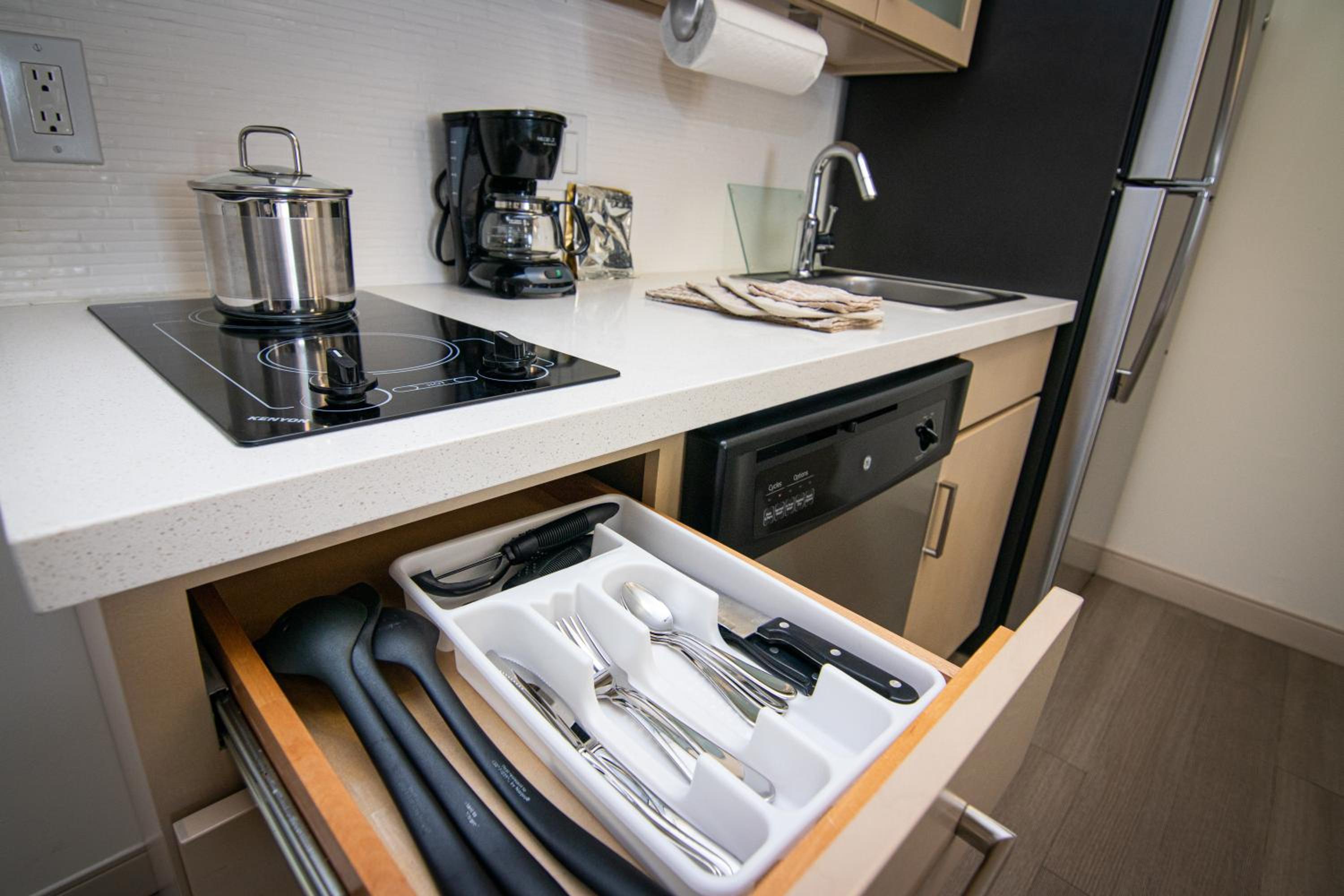 Guest rooms feature a cozy seating area, flat-screen TV, private bathroom, and a convenient kitchenette with modern appliances.