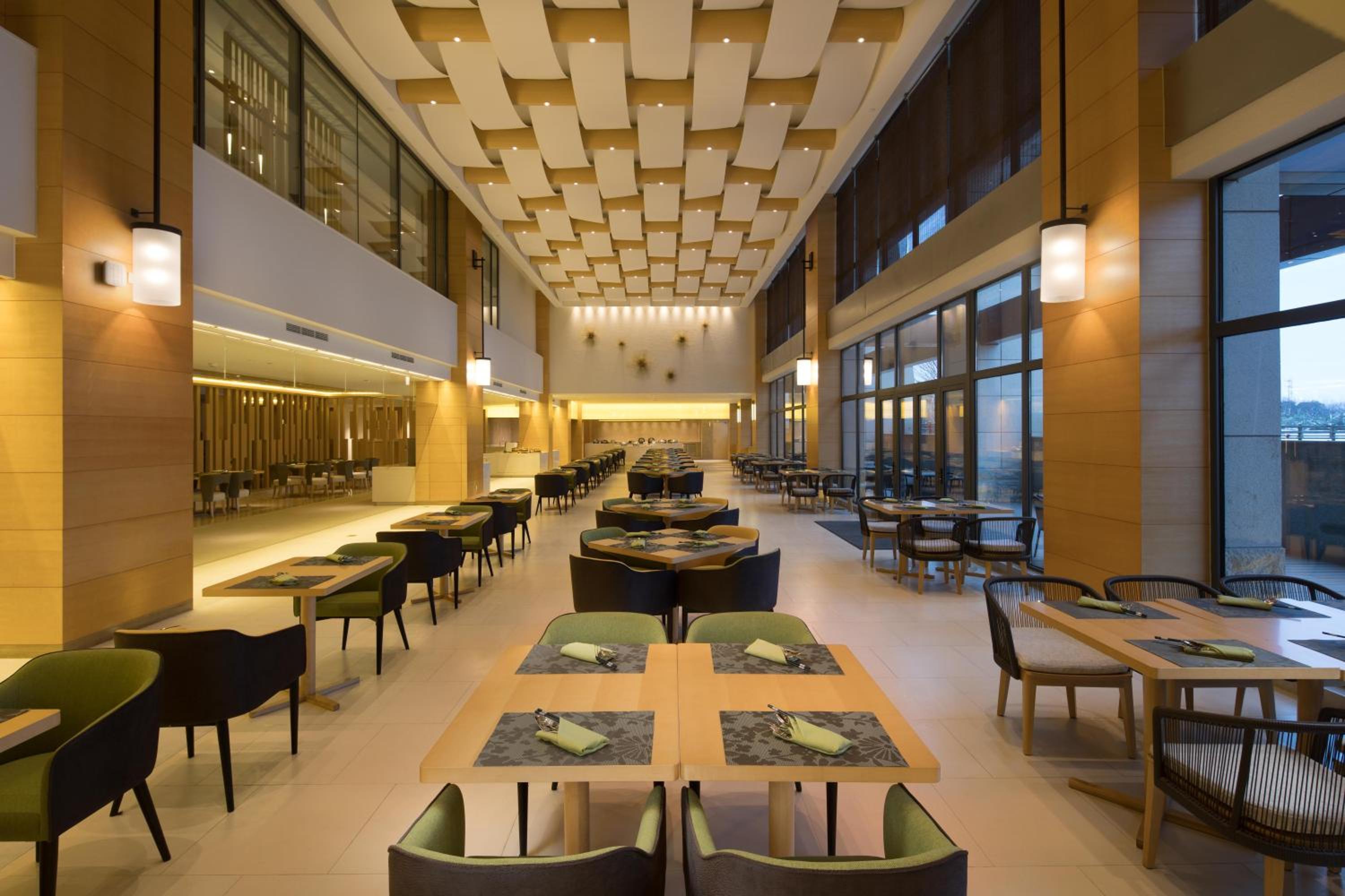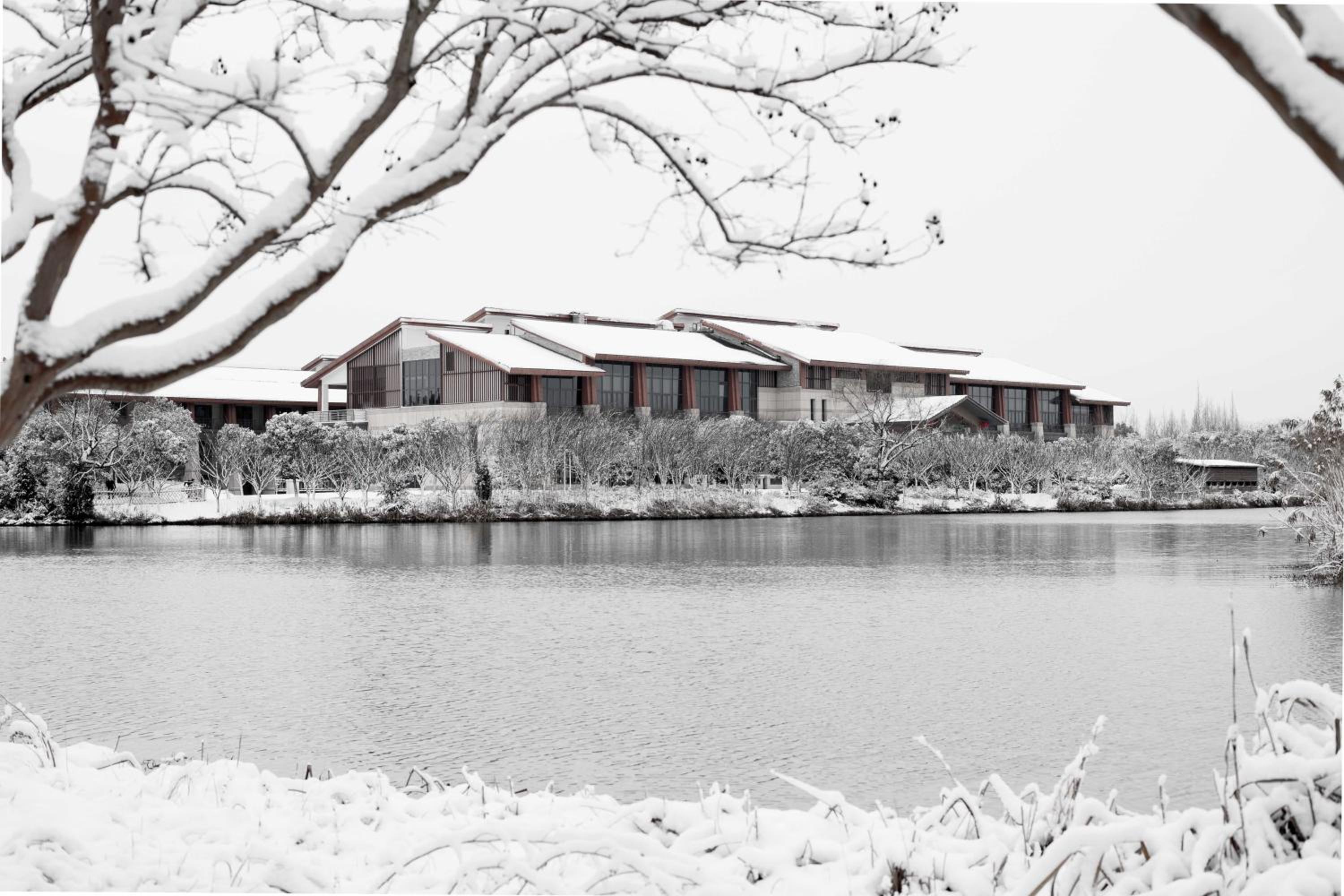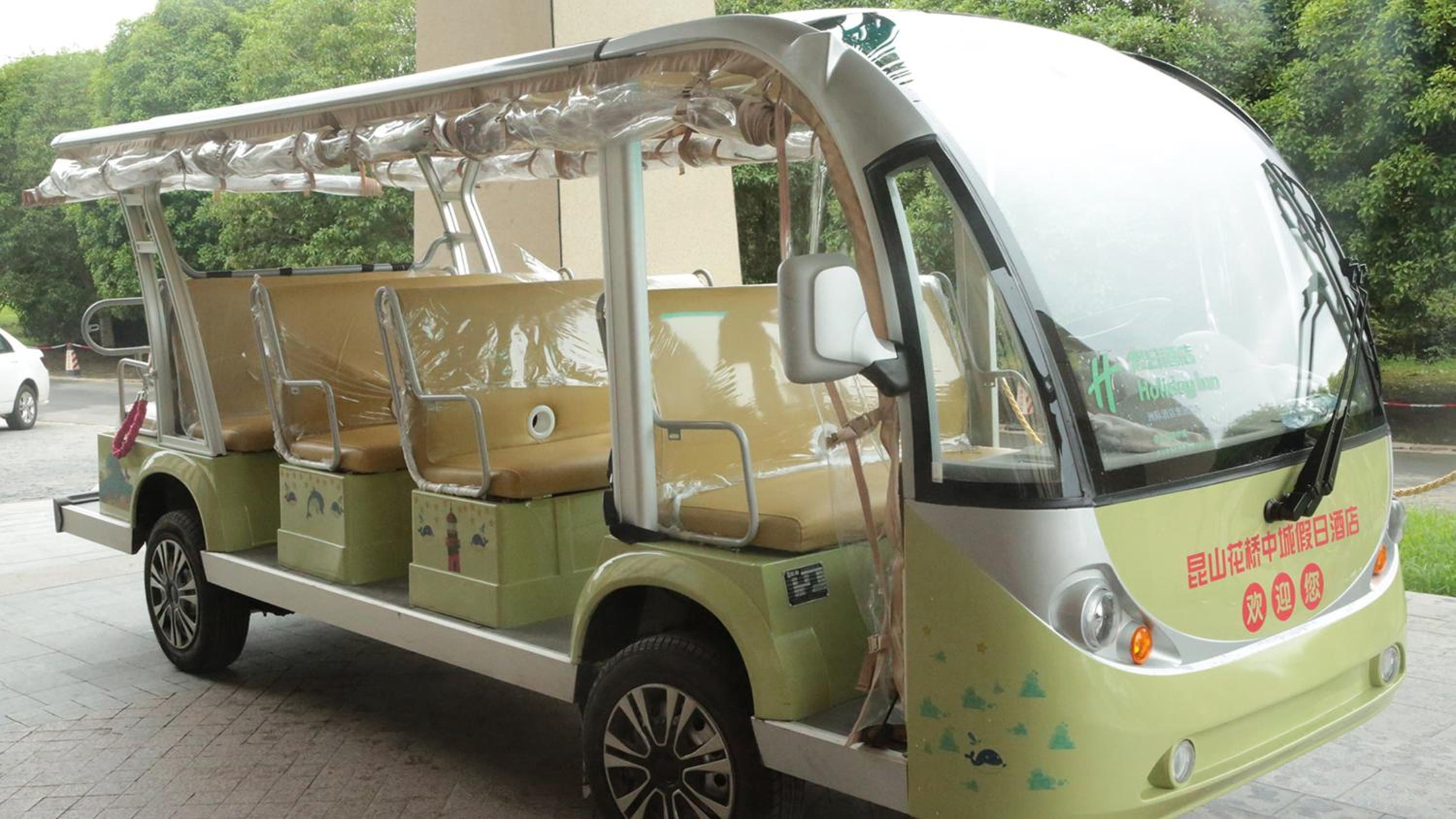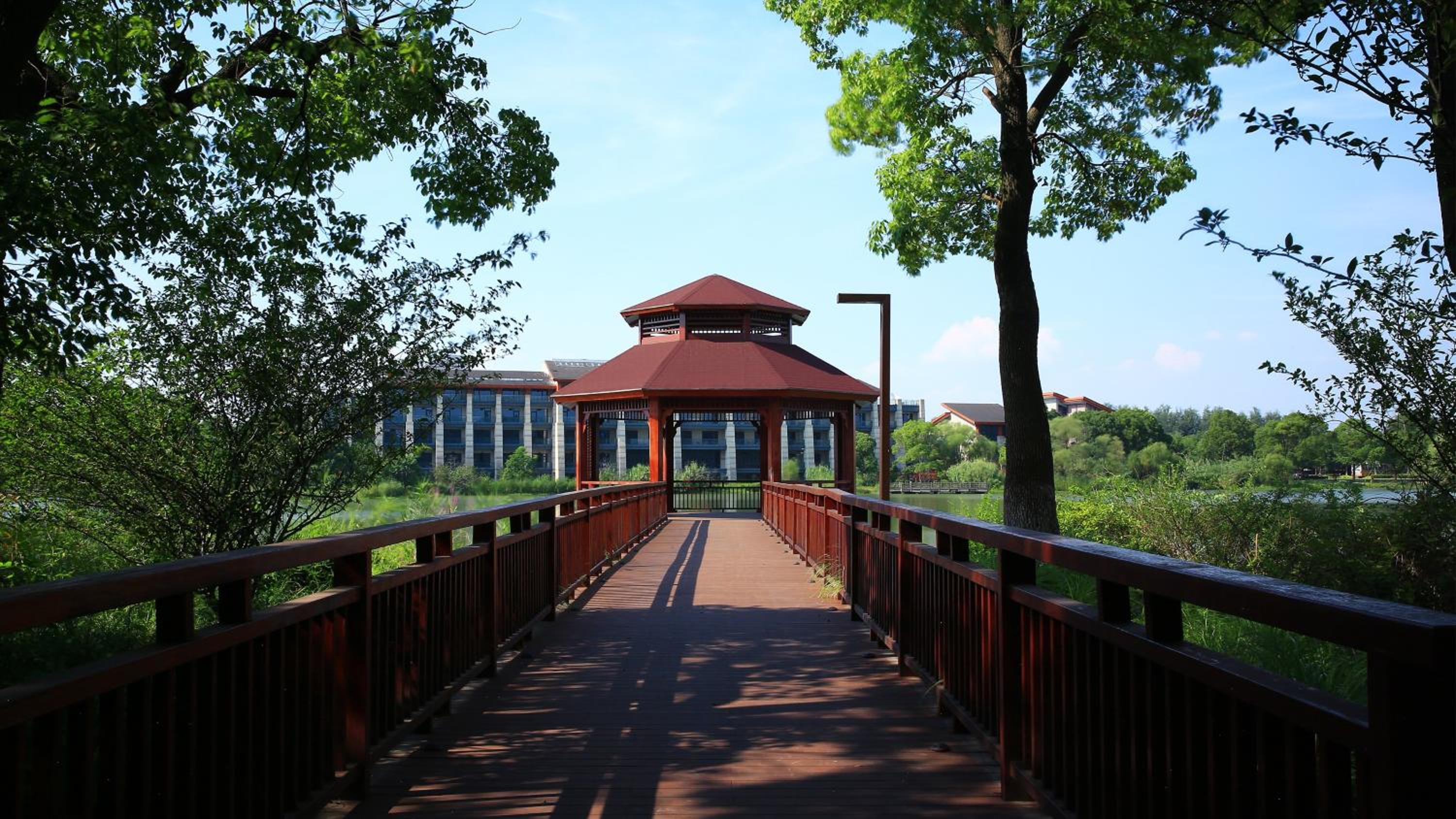 This hotel is located in lovely park with lake a little bit far from the city. Car drive from Shanghai international airport takes about 2 hours. No restaurants or shopping available in walking distance. In the park area cars are not allowed, but electric carts are available to bring guests to the reception.