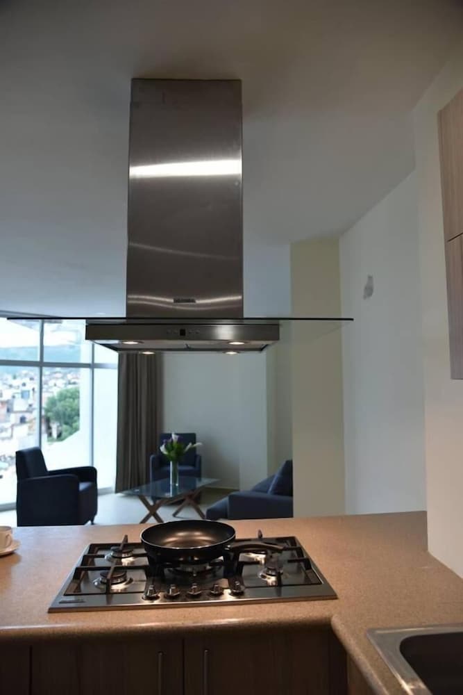 I had a 2 bedroom apartment with a 4 burner stove and living room. This hotel also has the best gym i've ever used in all of Mexico! If you're into weight lifting, it has everything you need: Adjustable incline bench, 2 lat pulldown machines and a row, along with adjustable rack for pulldowns or curls and a preacher curl bench! Free weights as well.