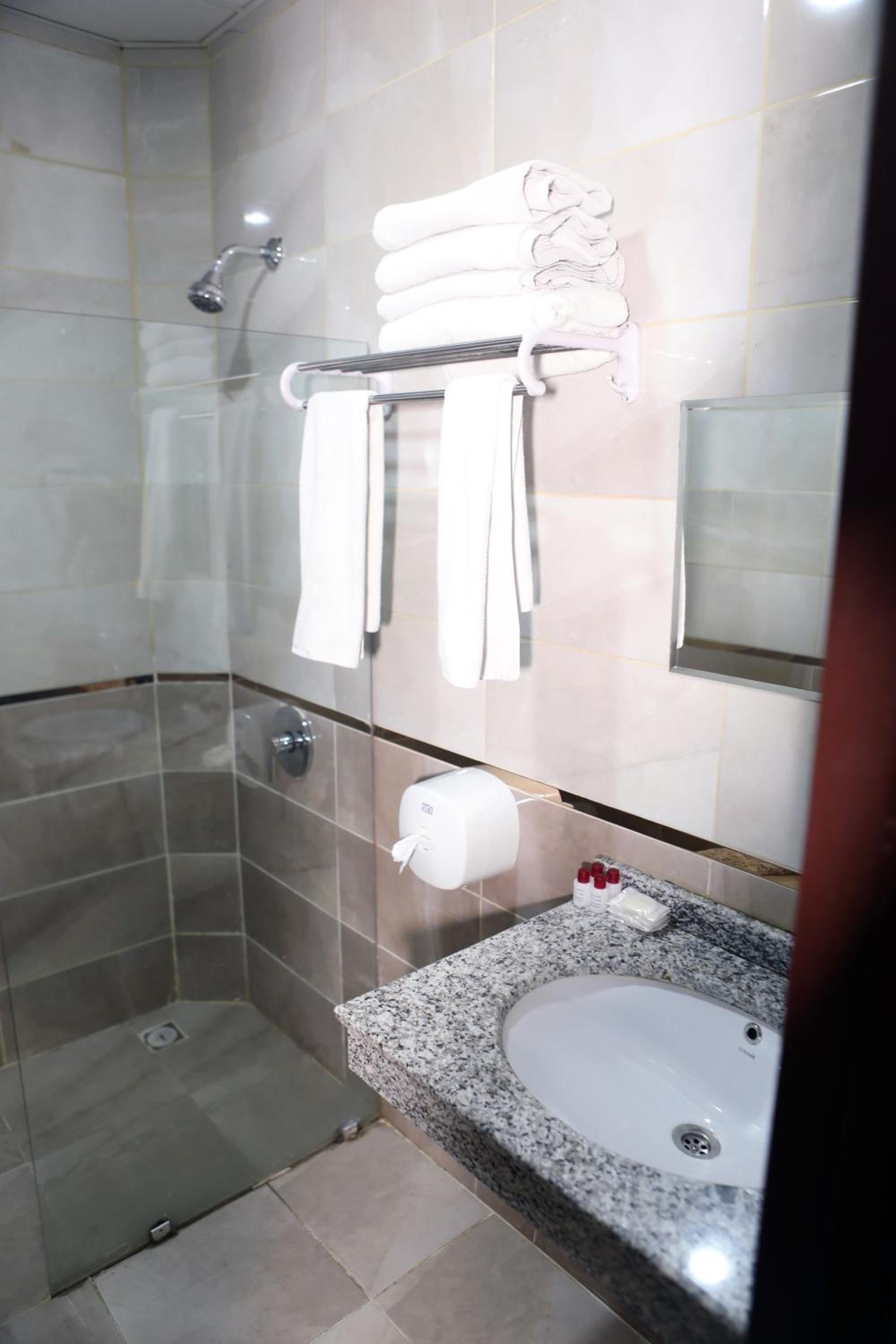 The room was ridiculously small — it was nearly impossible to move around without hitting something. The only chair provided was broken, the hair dryer was out of order, the soap dispenser in the shower did not work, and the towels were very worn out. Altogether, the room felt poorly maintained and uncomfortable.