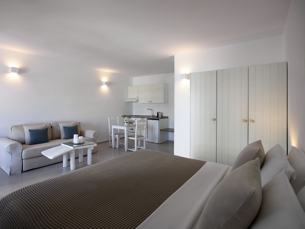This is the most amazing property!! We loved every minute of our stay and did not want to leave. Our family of 5 (parents and 3 teenaged daughters) loved the large, comfortable accommodations and beautiful property. The pool was serene and the service impecable. It is a very peaceful and quiet place with gorgeous views down onto Ornos beach.