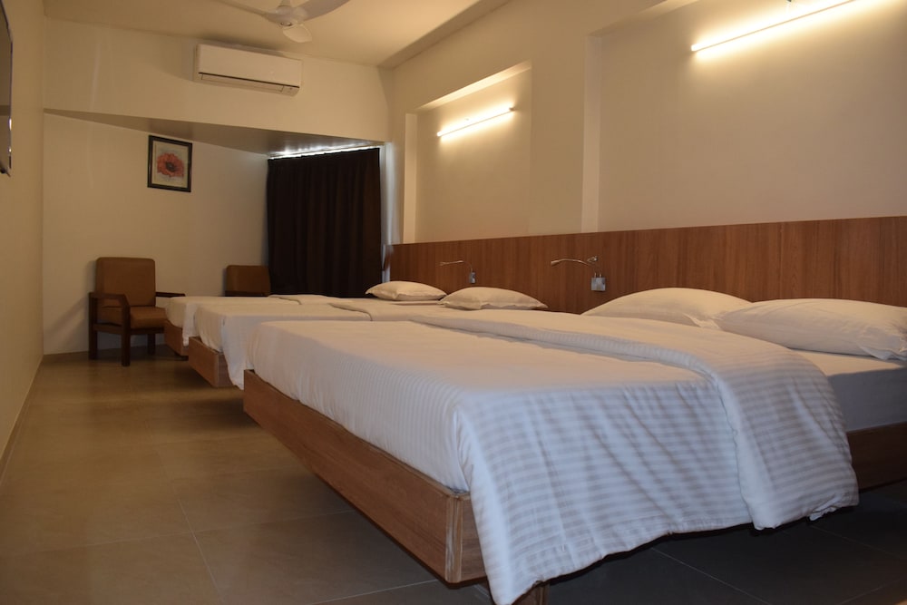 Great hotel,Large bed.We stayed for one night with two kids and booking through goibibo.Parking is available.Best part of the hotel is the restaurant.Veg(Gujrati) thali was great at in-house restaurant Rangat.Each and every sabji made by cook was delicious.Best part was price was decent too.Love the restaurant.