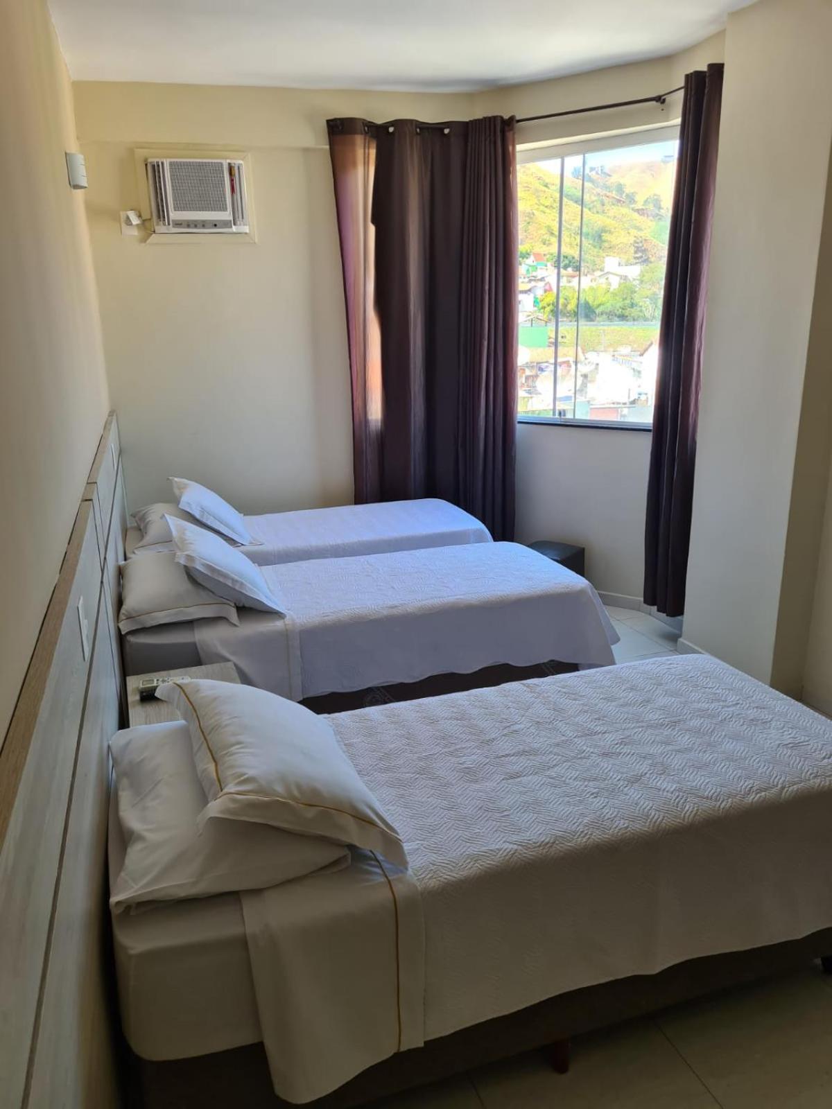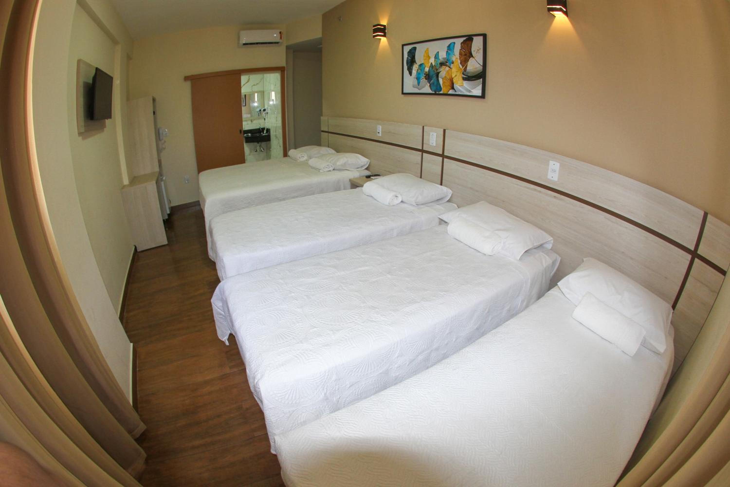 O quarto é muito pequeno, cabe 3 camas mas não cabe 3 pessoas, só cabe dormindo, enquanto um anda os outros dois tem que sentar ou deitar. É muito apertado e a cama de solteiro é pequena. Na minha opinião era melhor dizer que os quartos só cabem dois mesmo.