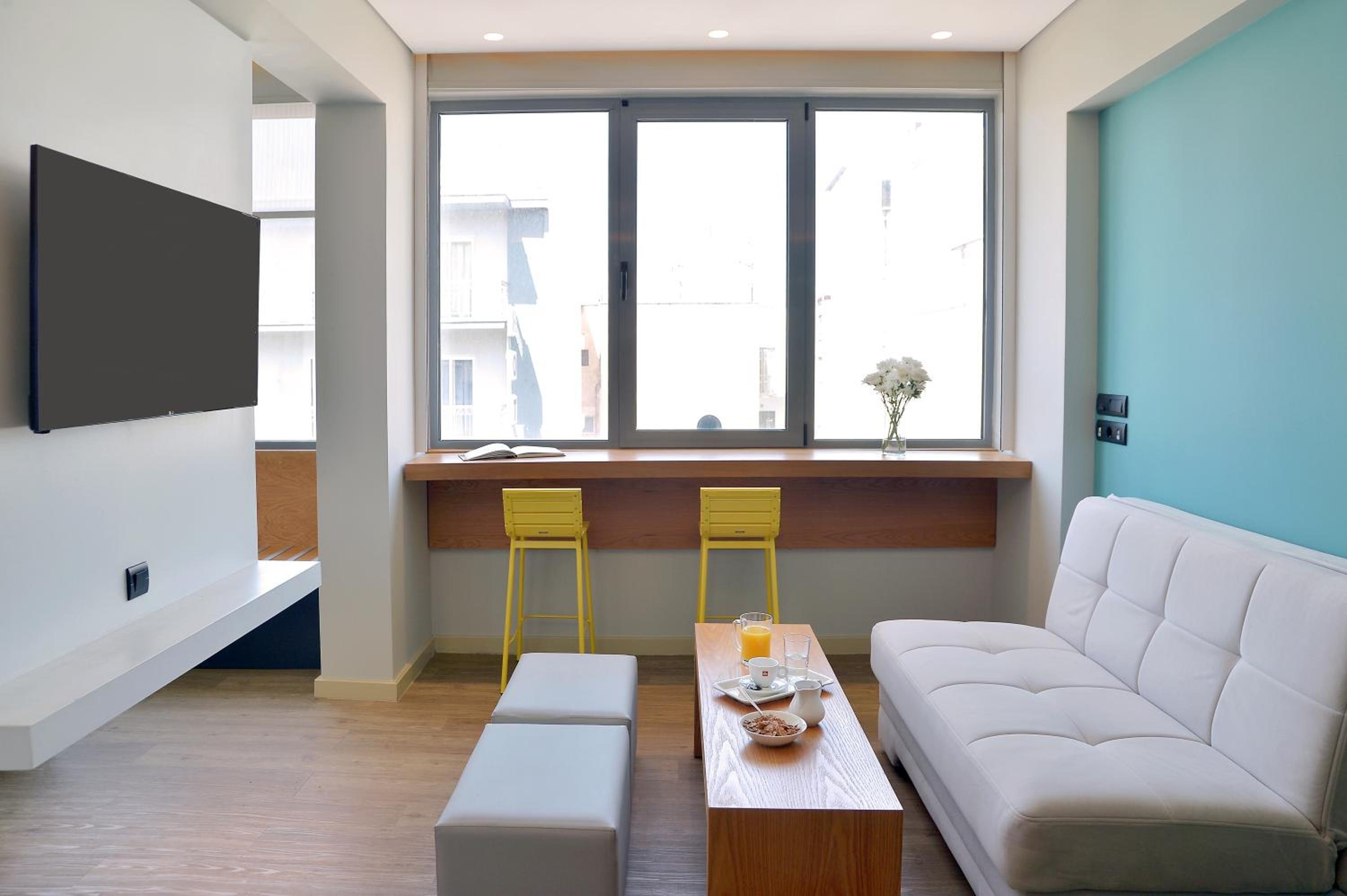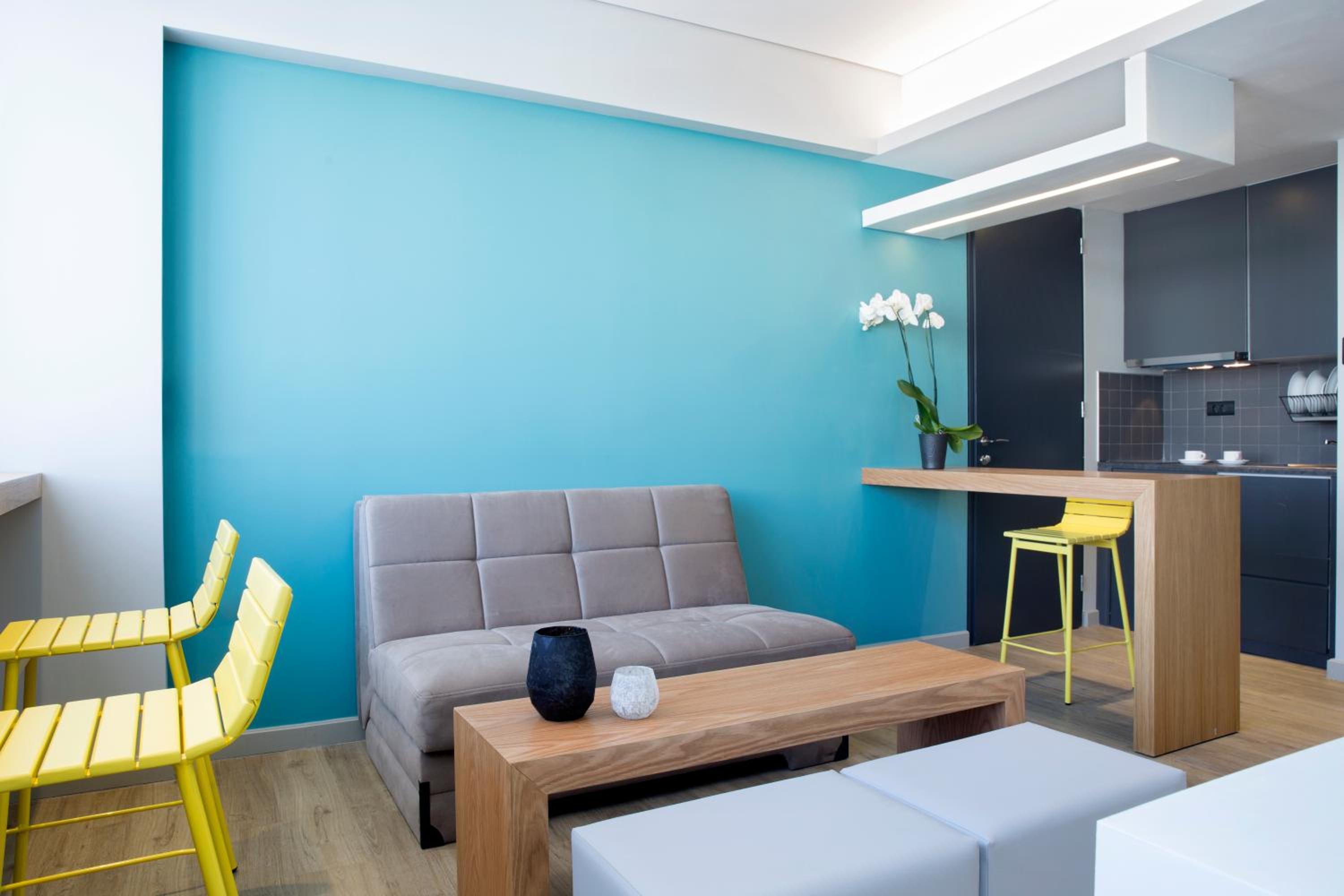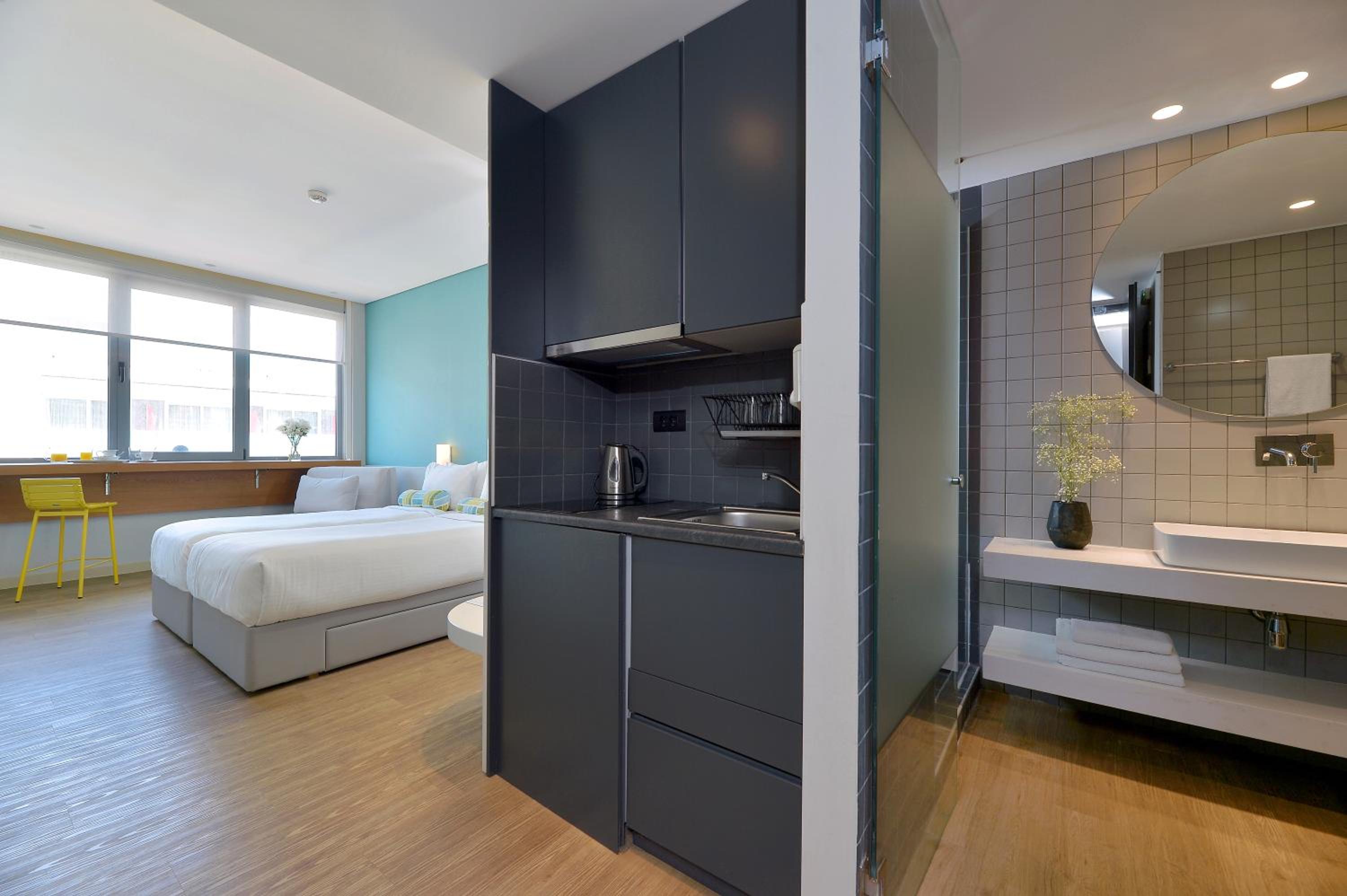 Experience comfort and convenience at Athenaeum K 29, where each modern unit comes with a kitchenette and complimentary WiFi. The stylish design and modern amenities ensure a pleasant stay, including sleek hardwood floors, vibrant decor, and a modern bathroom with a walk-in shower.