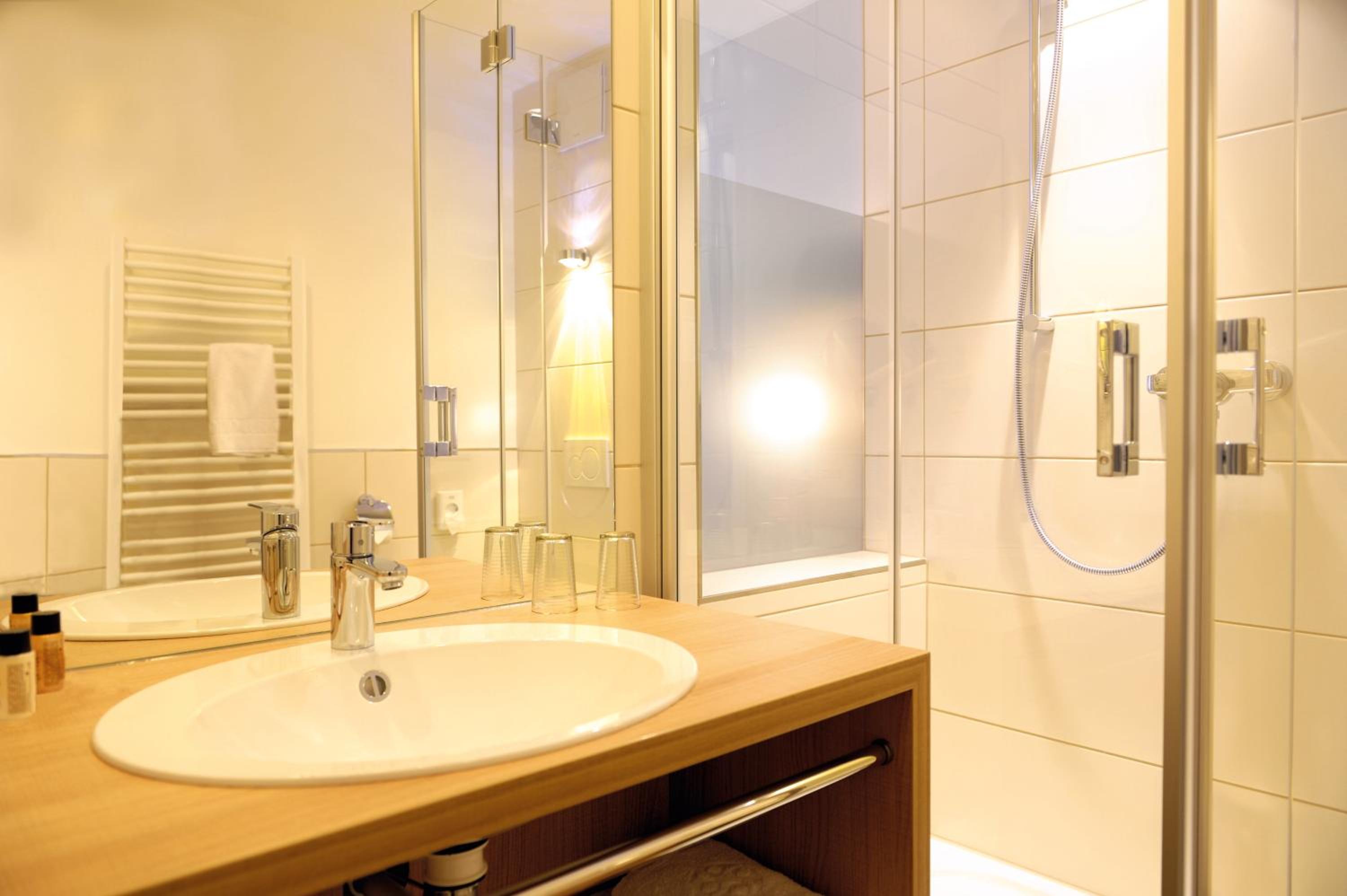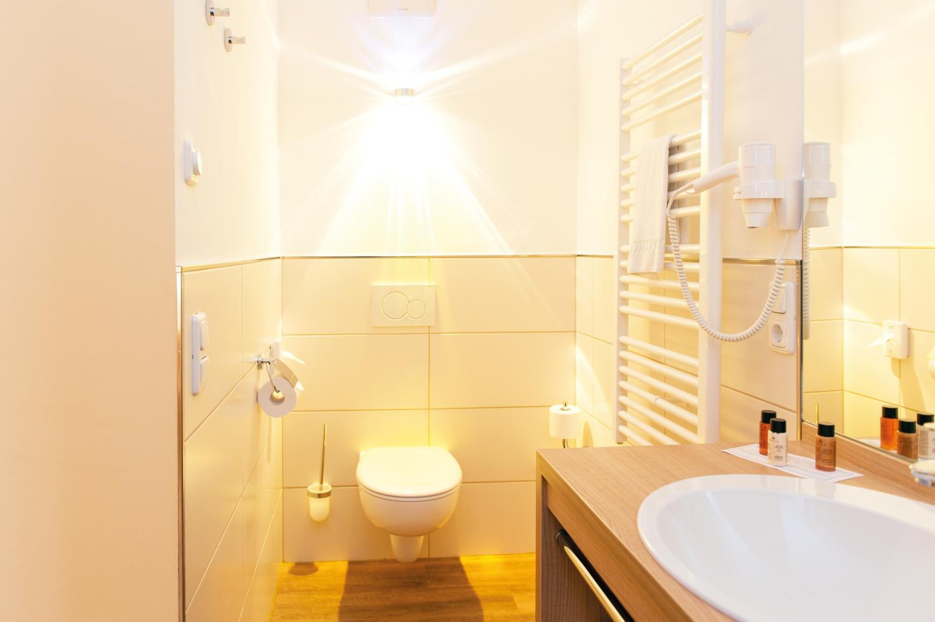 Man sollte nur wissen, dass die Dusche eine Milchglasscheibe hat, man sieht nicht wirklich was, aber ist evtl nicht optimal für alle die Zimmer teilen