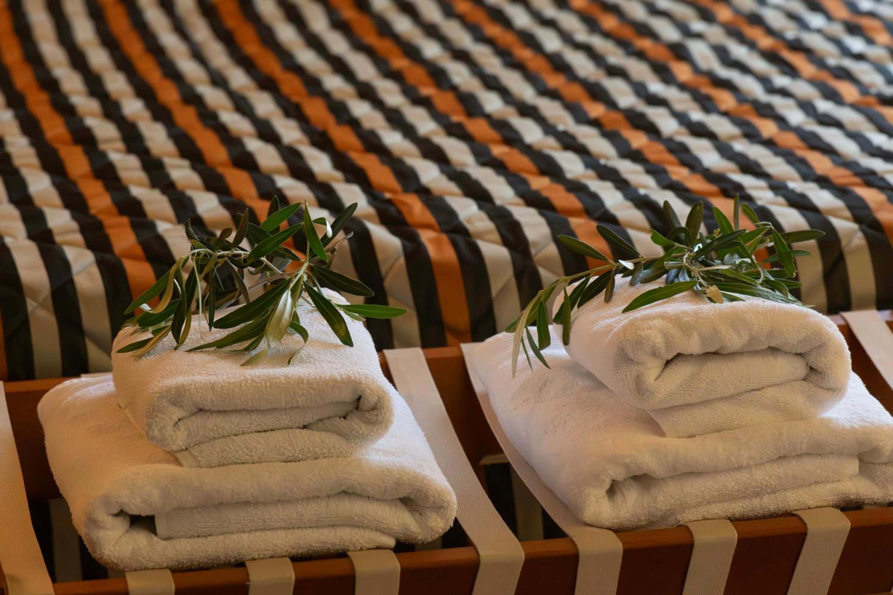 Experience rustic luxury in bungalows made of stone and wood, each featuring a fireplace, air conditioning, and stunning views of Mount Olympus.