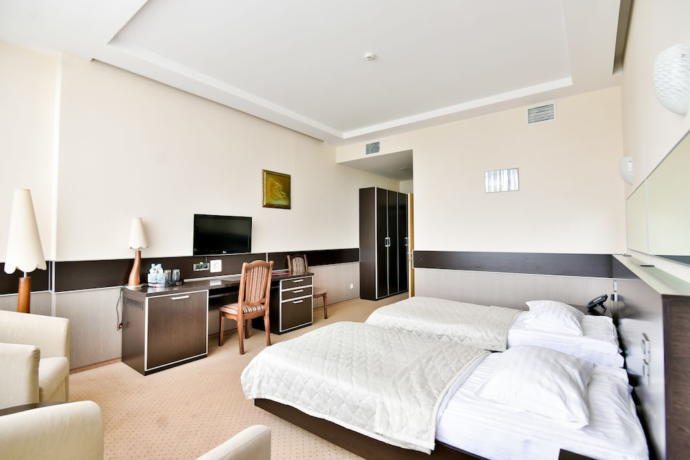I stayed in a beautiful and spacious room, with a huge bathroom. Everything was perfect in the room and the food served in the hotel is delicious. The hotel is connected to a SPA, which has everything in order to relax: a big gym, swimming pool and four saunas. The only one discomfort is the distance of the hotel from the city center. It takes approximately one hour by bus and metro to reach Kiev city centre. One has to count also the fact that the breakfast and the SPA usage is not included in the price. In case you have time, it`s a great hotel to relax and to work on your computer.