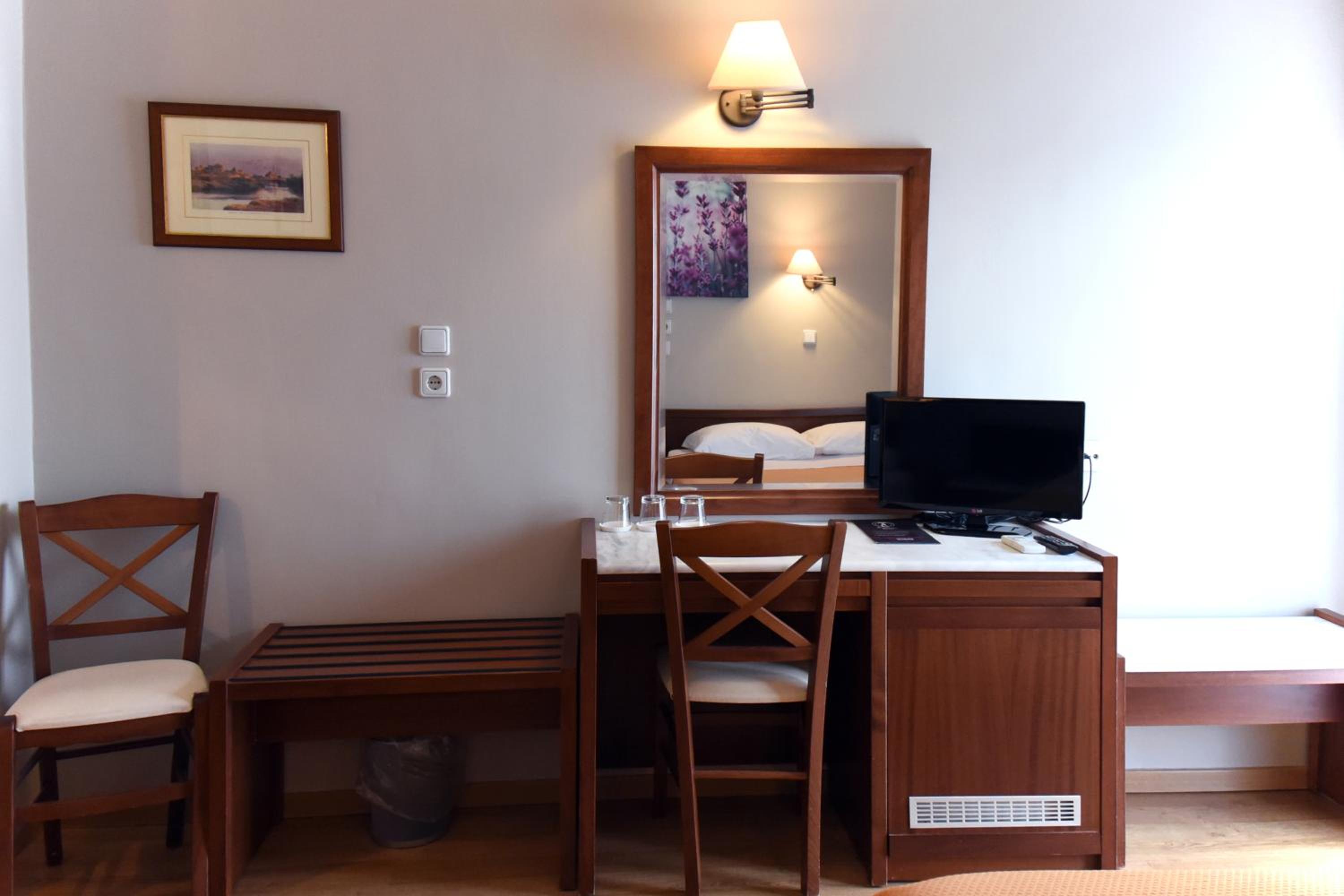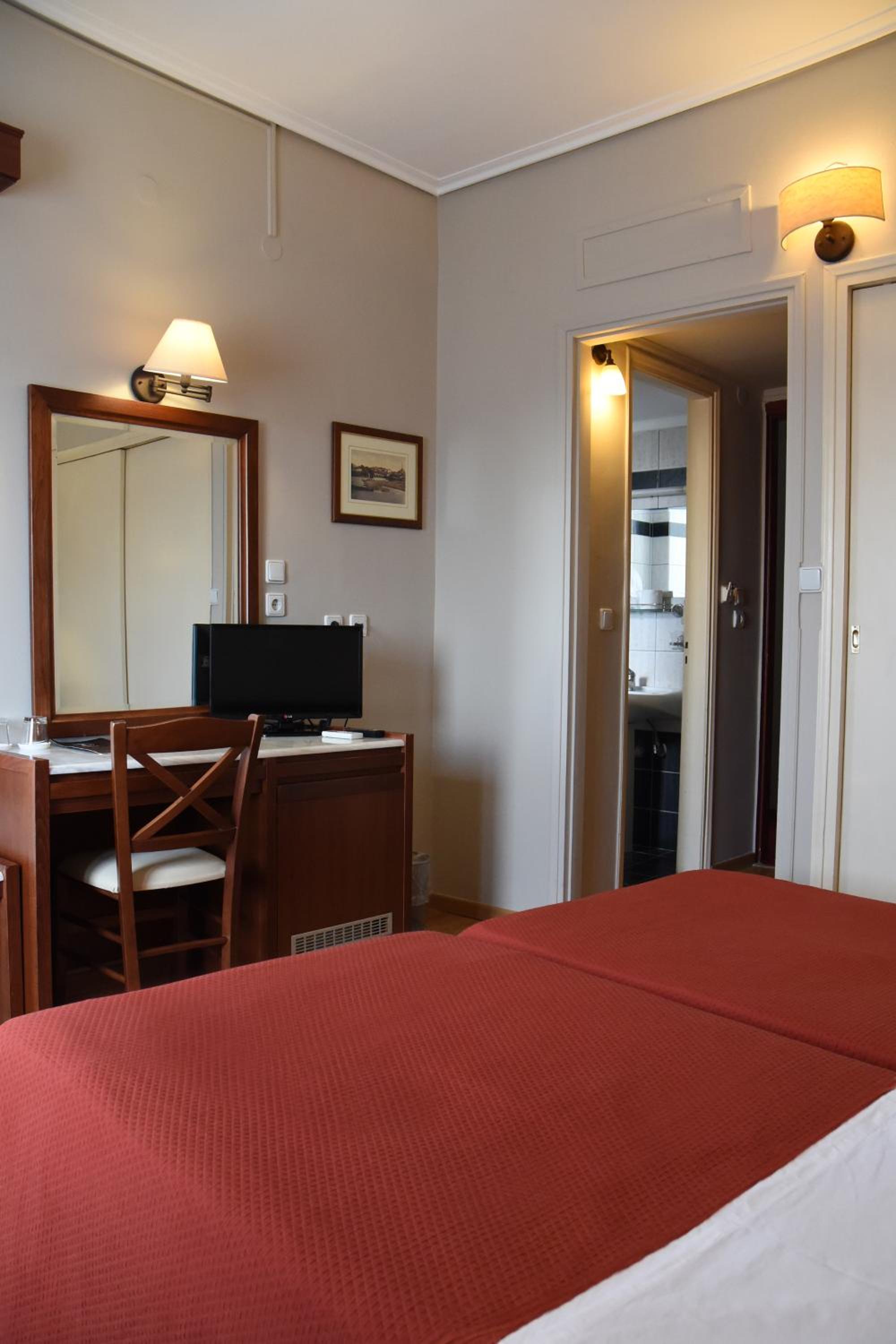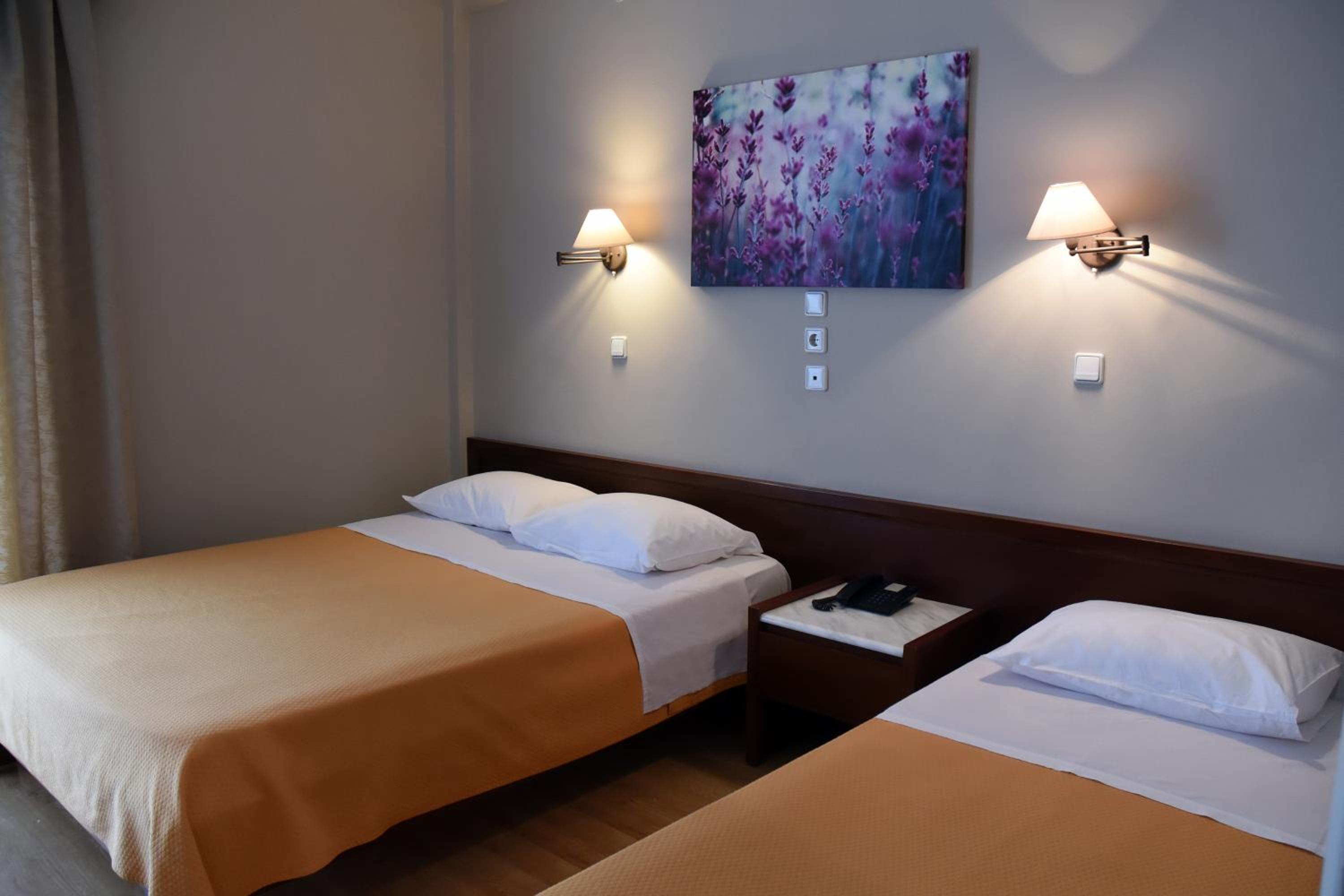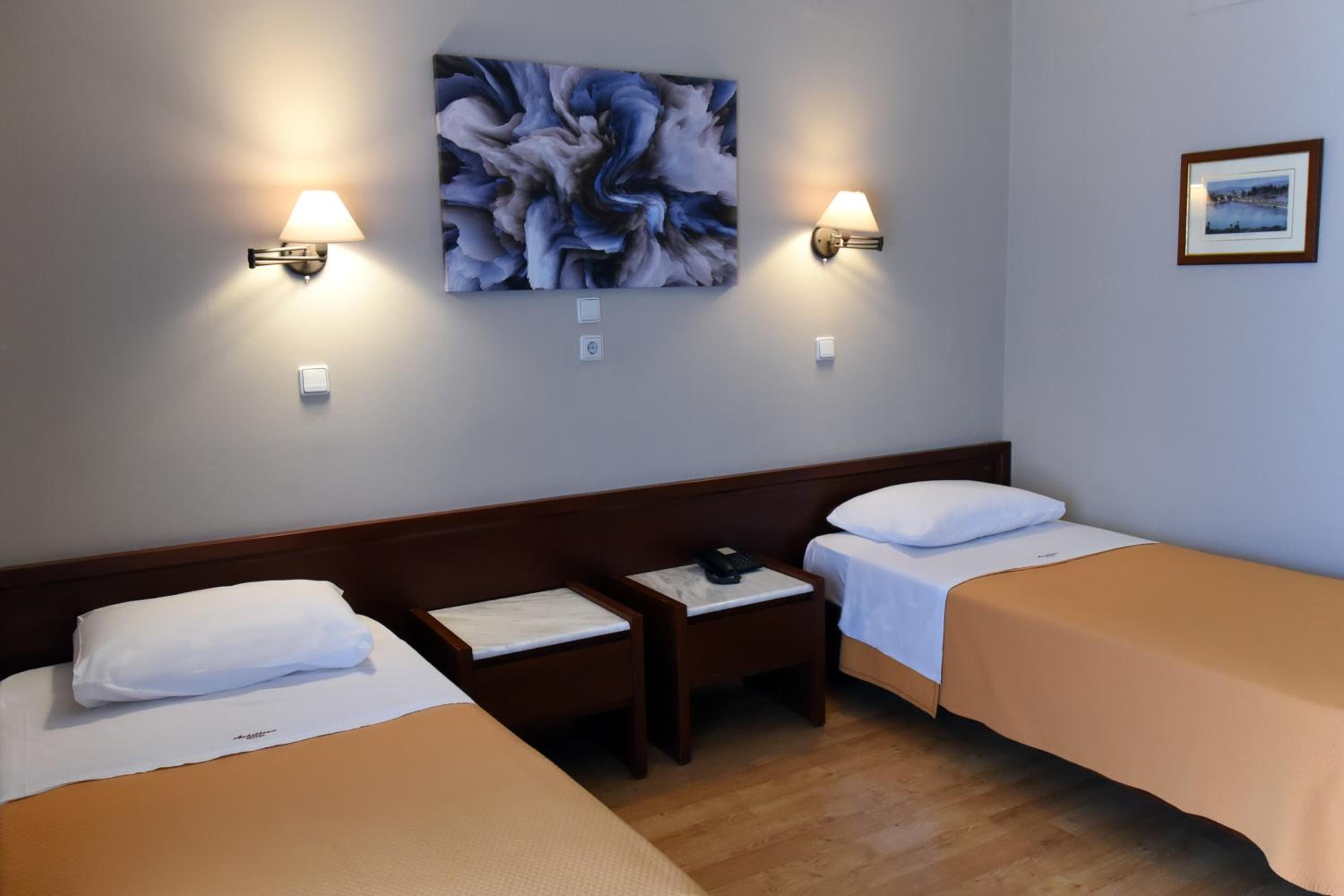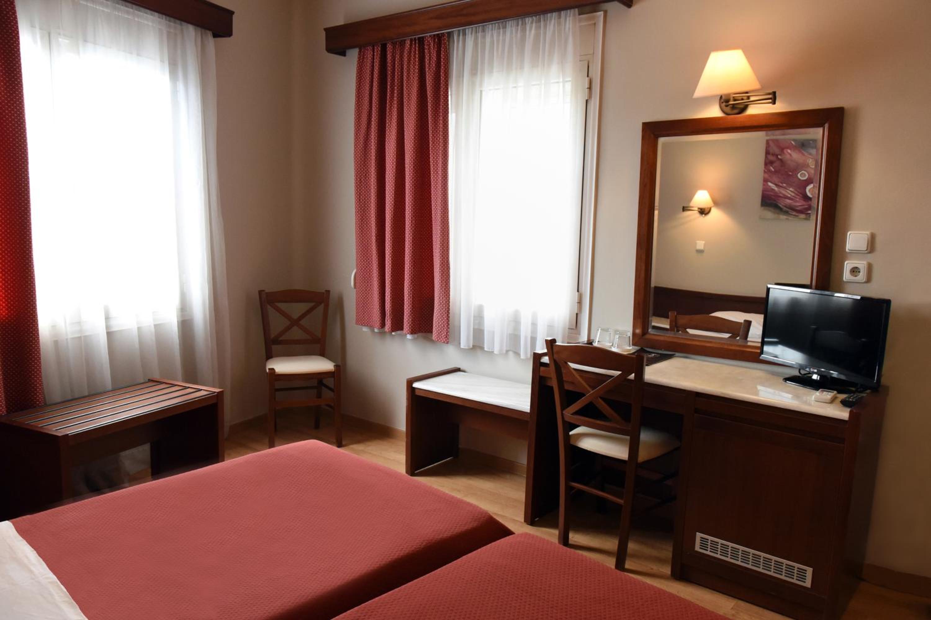 The air-conditioned rooms at Hotel Achillion boast stylish modern decor with a range of color schemes. Each room is well-equipped with a TV, fridge, and a private bathroom, ensuring a comfortable stay for guests.
