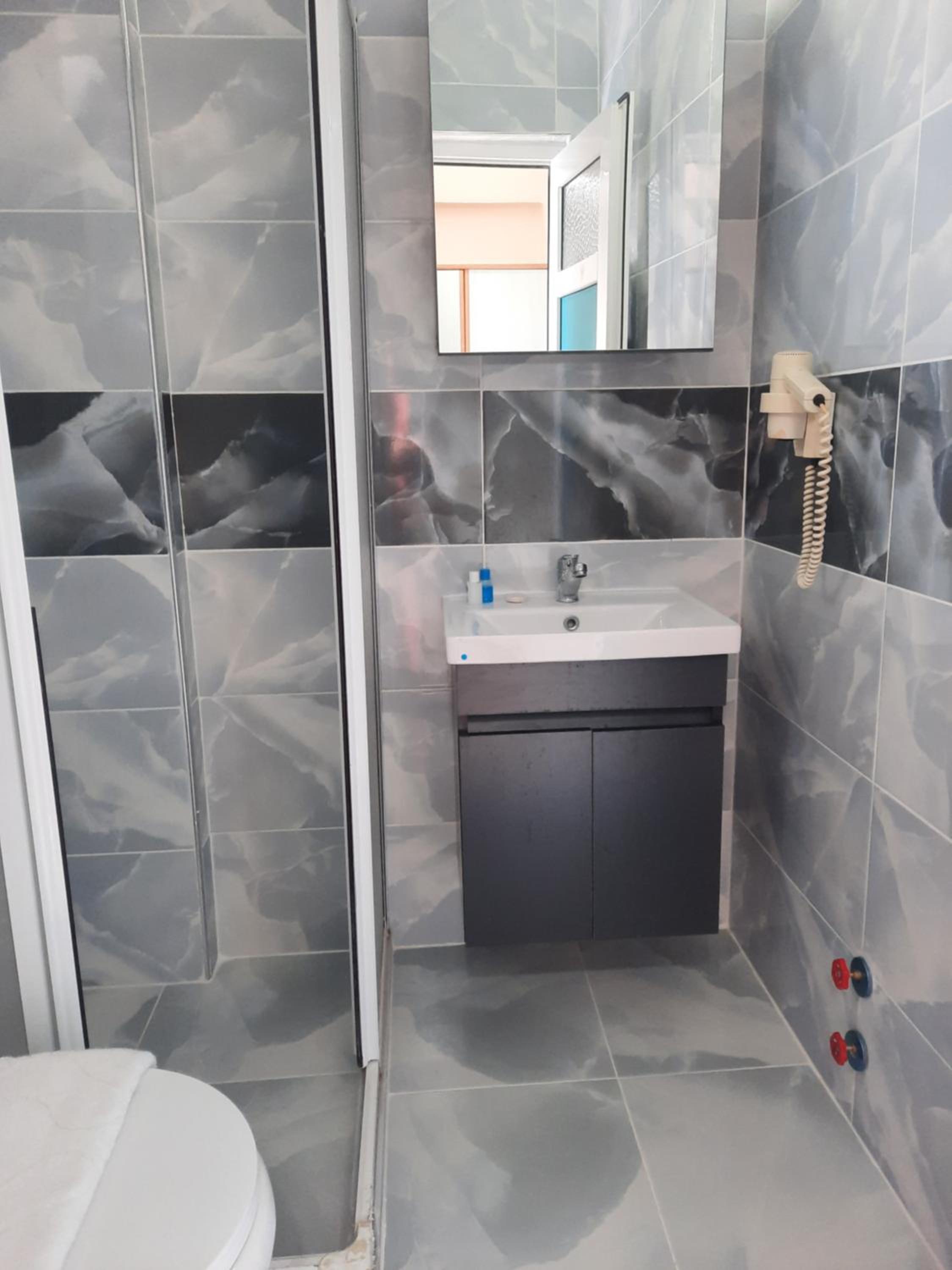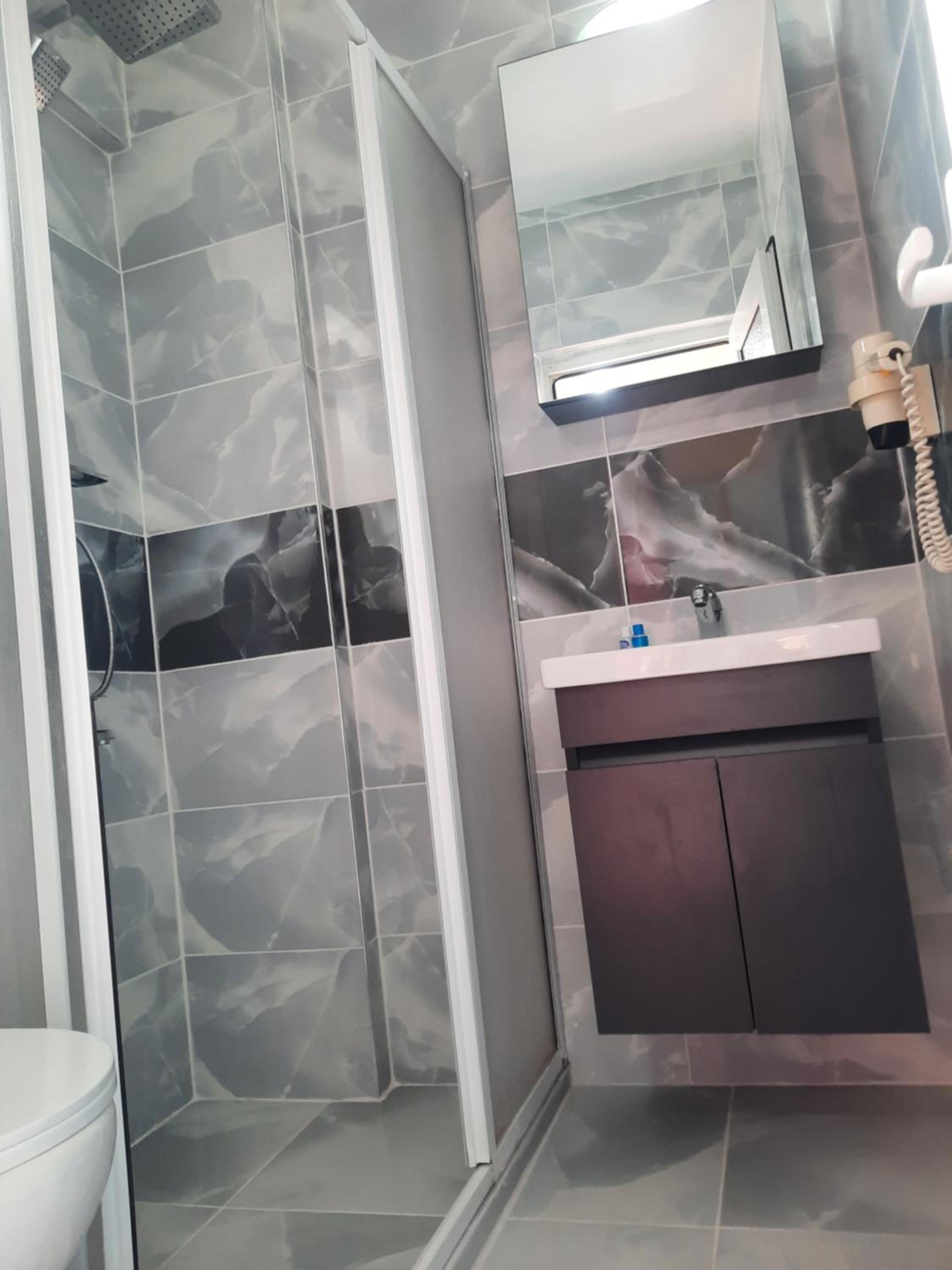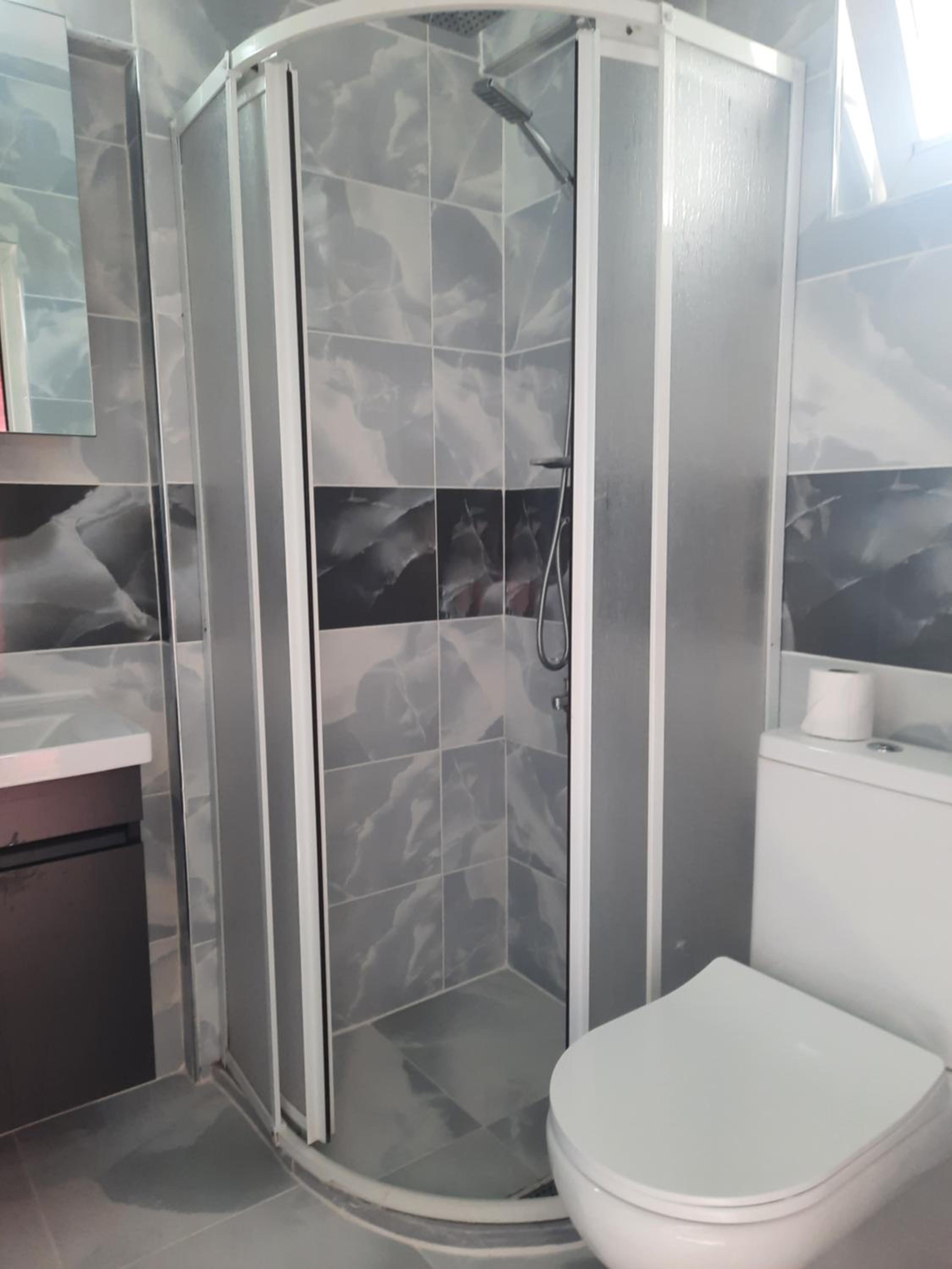 Toilet is slightly small but still able to shower conveniently. TV did not work at all.