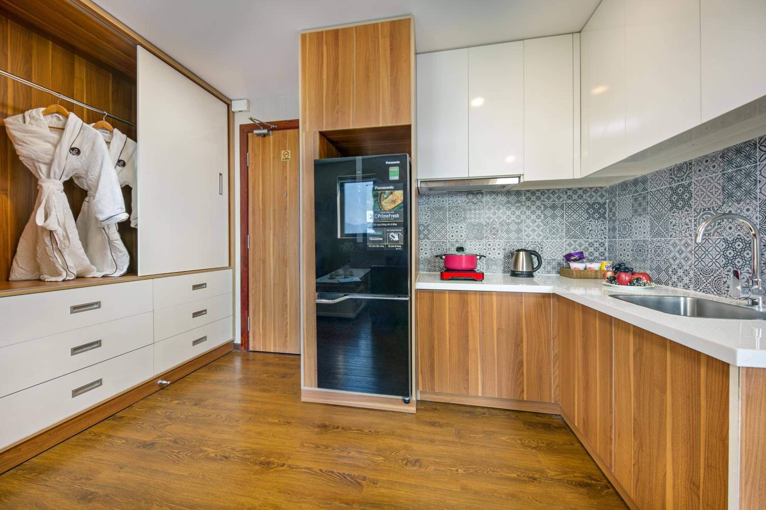 We had a bit of an issue on arrival. We had booked an apartment with a kitchen so that I could cook. It said stove top, kitchenware and microwave would be in the room but when we arrived there was nothing. I had to ask for a knife, stove top, chopping board, cutlery... The lot basically. But again. The staff got onto it straight away so I can't fault them at all. The other issue is the shower system, it completely soaks the bathroom floor when you shower as there is no shower tray, & the water pressure was awful, it was barely a trickle. There is also only 2 spare sockets in the room. We had to boil the kettle in the socket by the bedside cabinet as there are no sockets on the wall in the kitchen. We also went to use the gym but discovered none of the machines or equipment worked which is a shame as it was a great sized room, lovely view so had great potential. All in all the hotel is okay, staff are amazing, but it could do with some tlc & updating.
