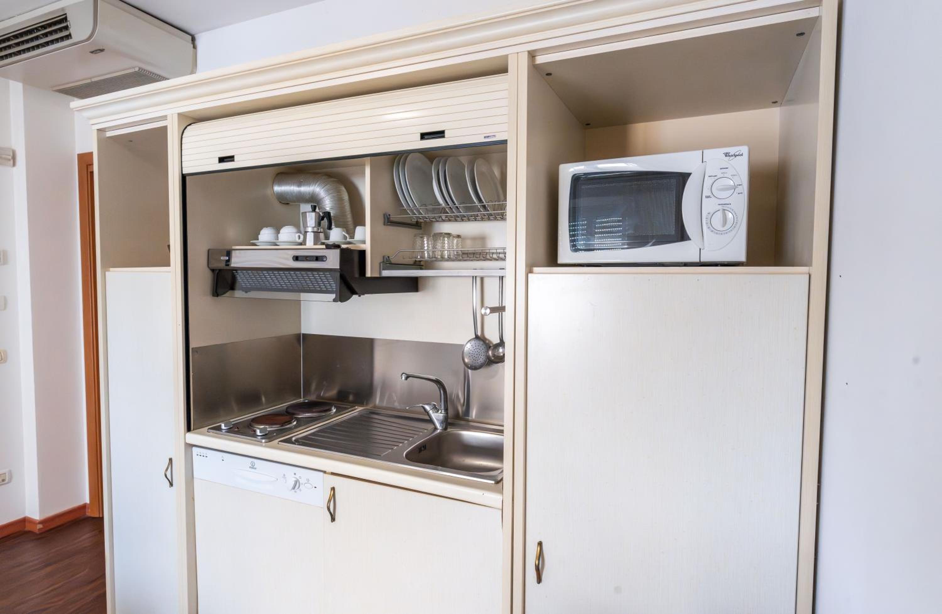 Our air-conditioned studios and apartments come with modern amenities including a dishwasher, DVD player, and a kitchenette with a microwave and refrigerator. Everything you need for a comfortable stay.