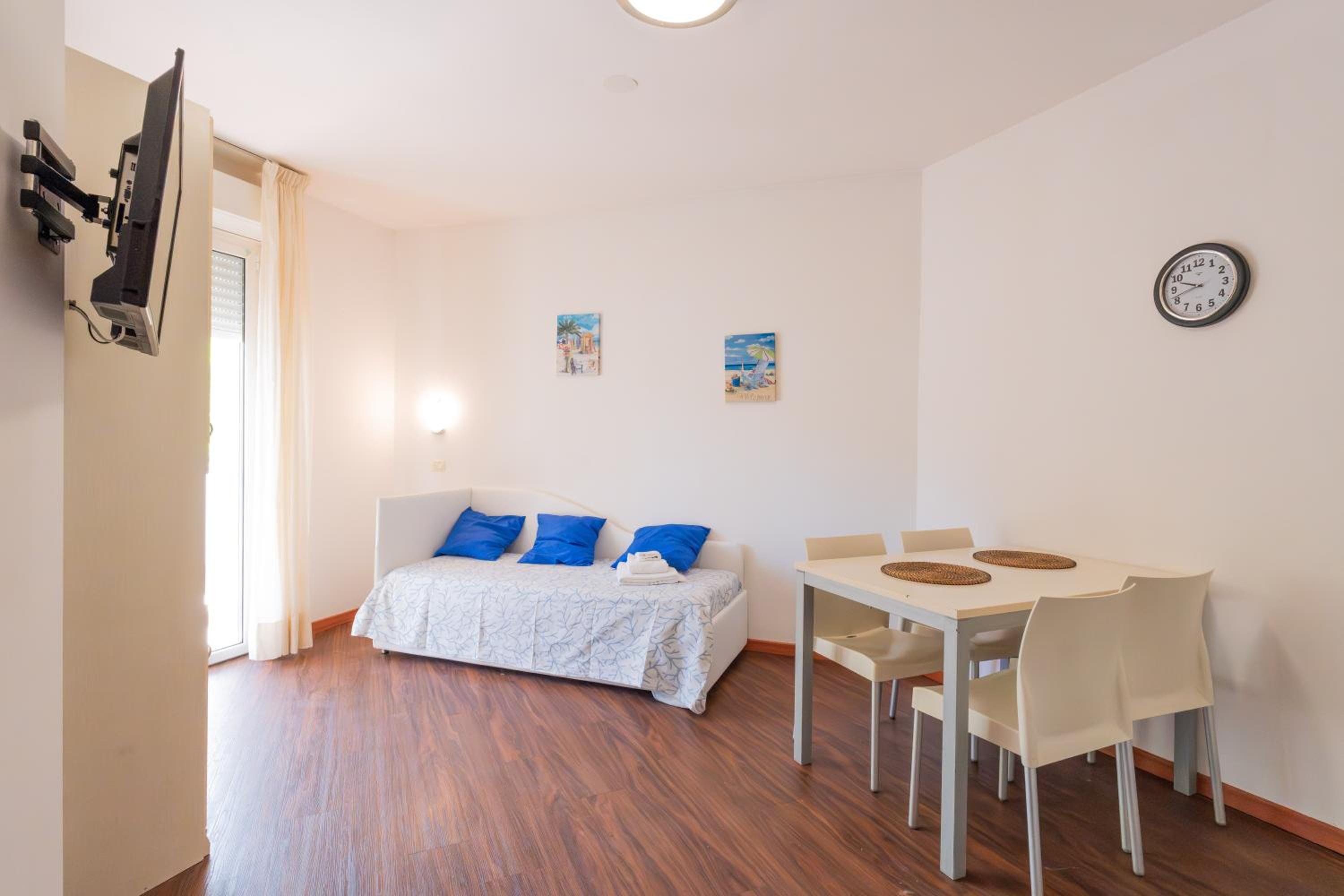 Spacious studio, all necessary for beach holiday was provided, also all kitchen appliances. Parking is available in the building, which is very important in this crowded area. Close to the beach and range of grocery stores within walking distance.