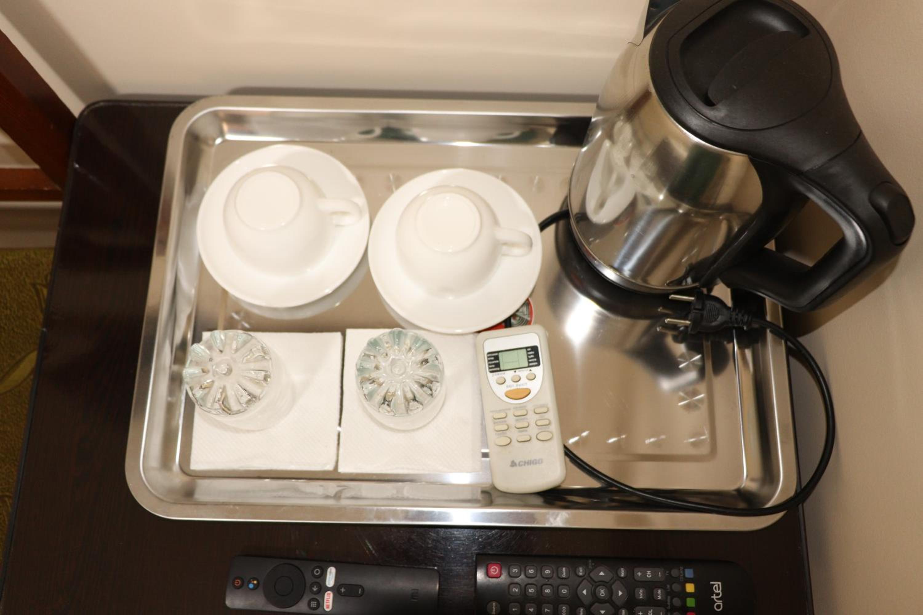 There is free water, coffee and tea available in the kitchen, which can be used to warm up a meal (but not cook). There is also a fridge and a washing machine. They can exchange money for you at competitive rates.