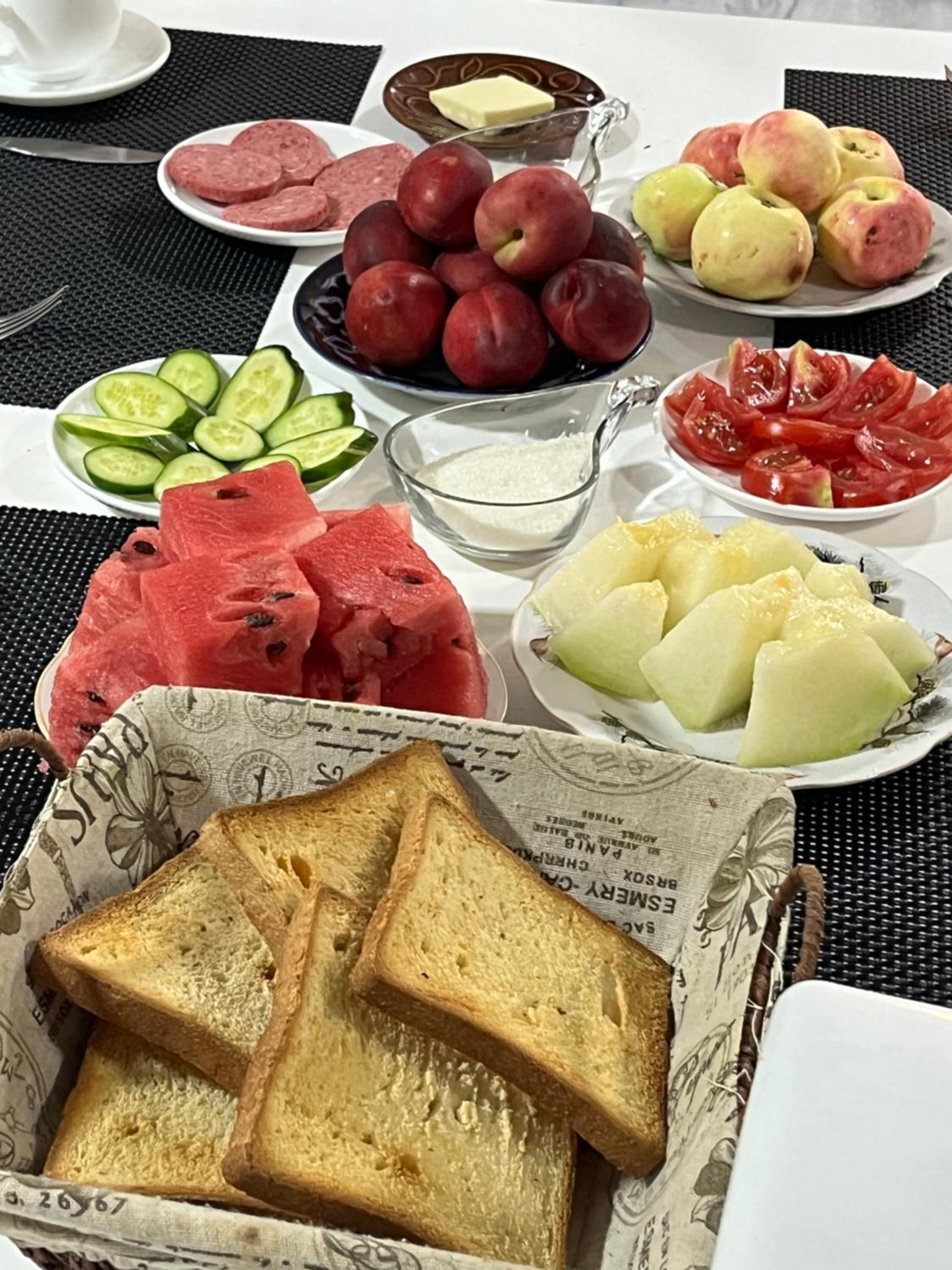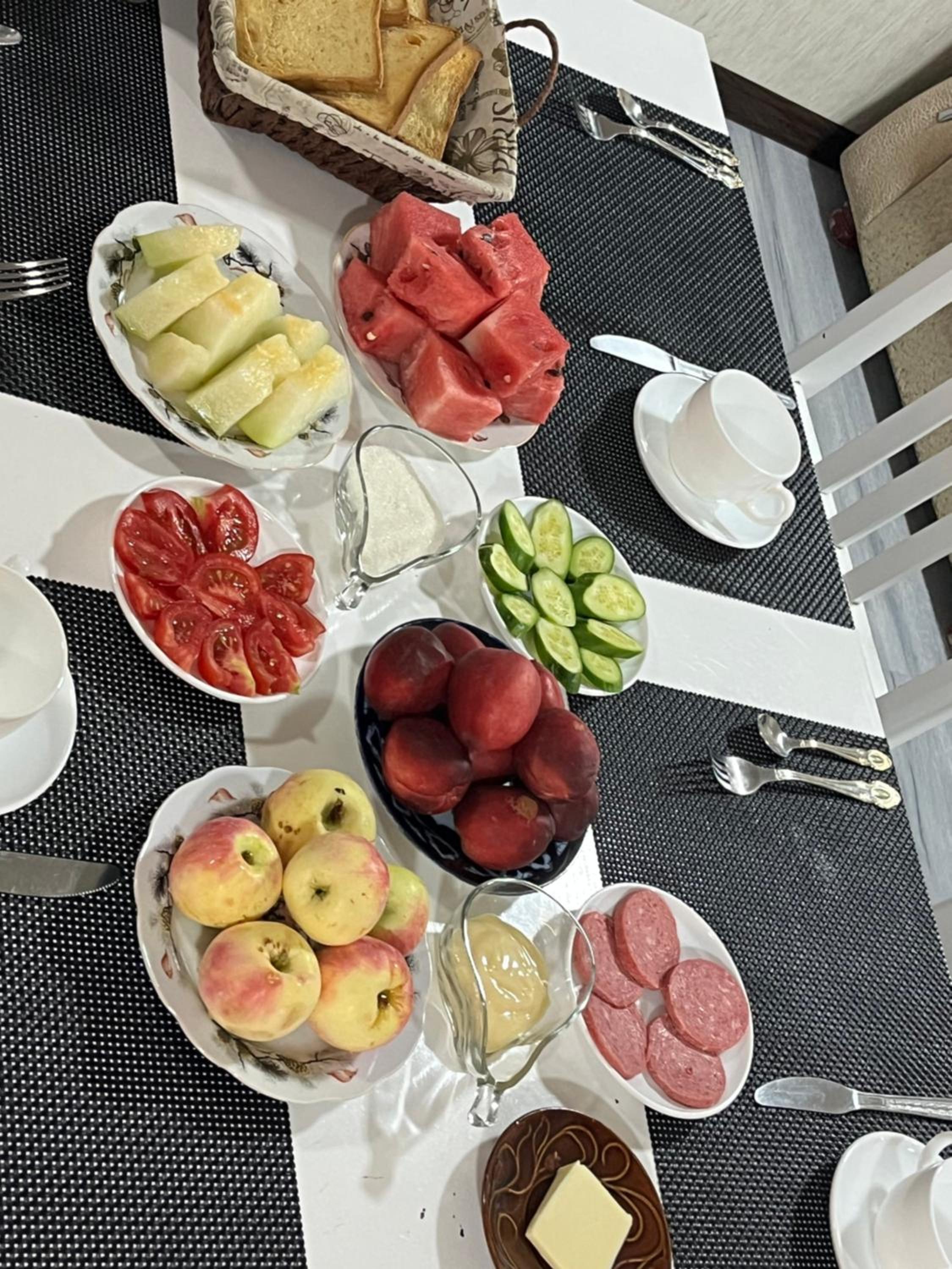 The first day we had not an adequate breakfast, just a smallish dish of mashed potatoes, some slices of tomatoes and fruits. But the second day it was more satisfying. Non vegans have two eggs with sausages plus fruits.