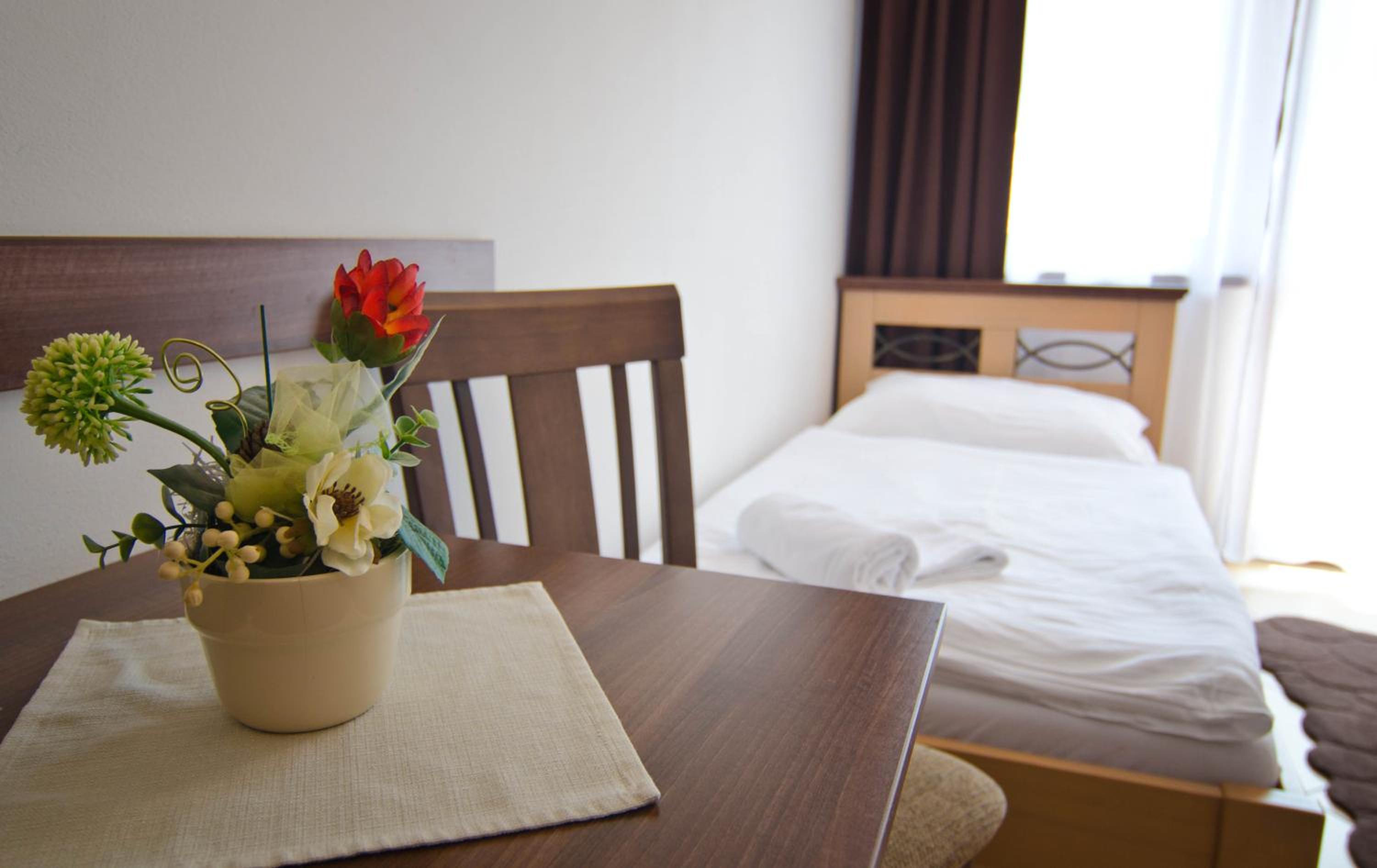 výborné snídaně, útulný, čistý a pohodlný pokoj s balkonem a výhledem na hory, hotel má skvělou polohu a záplavou květin připomíná alpské hotely.