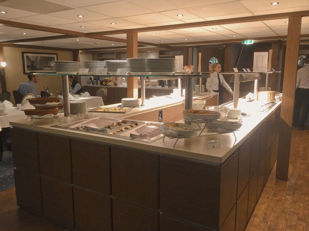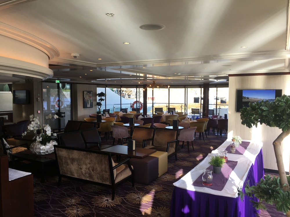 Loved the room - very modern and clean. The restaurant and bar were excellent - this was not a cruise; the ship was moored for a big conference in Dusseldorf. The bus we used to get to the conference was very nice & took us straight to the ship.