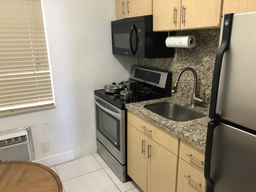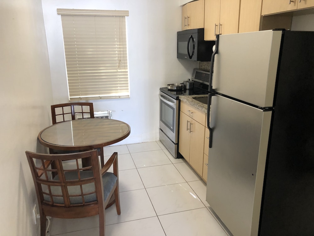 Our family weekend was cut short by our decision to leave early. After having witnessed a fist fight in the parking lot the first day and observing the clientele of this particular hotel we realized that this was NOT a place for peaceful family retreat. The amount of smoking taking place outside each room precluded one to catch any fresh air near the property where everyone seemed to chainsmoke constantly. Rooms were not well utilized and the AC unit could not cool the room down to a comfortable level to sleep at night. Kitchen was equipped with pot, pans and disches one would get from a flea market. When two "working girls" emerged from their apartment to meet their "friends" in the parking lot we knew that we had made a mistake in selecting this hotel for our stay. When