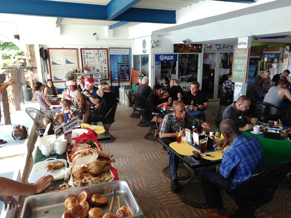 1970's decor hotel, no restaurant at the hotel, just a separate business running at the exact location. food and drink cannot be tabbed to the room, only paid in cash. sells itself as a PADI dive hotel yet the PADI dive center is another separate business. ( Staff at the PADI center have no clue how PADI certification works) room was not clean and a used disposable razor was found in the shower. this was reported to staff, yet despite this, the razor was still there after the room had been cleaned! The room had a fridge complete with a mini bar, yet on arrival fridge was unplugged and the contents were warm. remains of ice trays were melted and water filled the ice box. The patio/balcony door was poorly fitted and each whisper from the beach below could be heard. The stairs leading to the room from the ground floor had ceramic tiles that were loose and posed a considerable risk of tripping. the whole site was poorly maintained . the beach directly outside was dirty and covered in trash. There was open sewage discharged onto the beach 20 yards from the hotel. The photo of room 8 as shown ( the room I stayed in) does not show the crappy cheap US-style door handle and lock that offers no security what so ever.