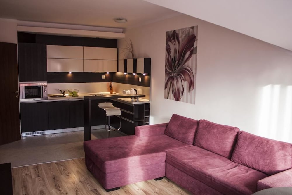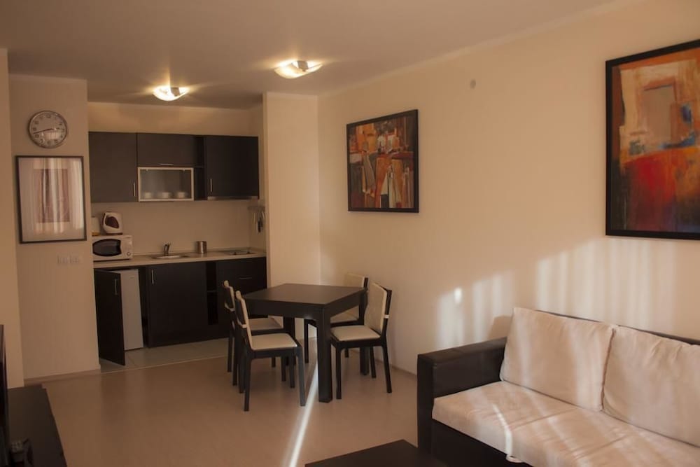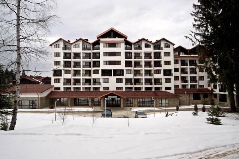 Apartment was more central than description and was only about 5 minutes walk to the gondola (all uphill). I would use ski depot lockers unless very fit. Ok facilities ,quiet location ,apartment was spotless and cleaned daily. Quite a modern design for Bulgarian Apartments (have stayed in a lot). Pack your own tin ,bottle openers and corkscrew .limited pans if cooking and no condiments. However ,had toaster ,kettle ,microwave and hob. Room also had good storage with iron and ironing board,clothes rack.small balcony. Bar area that does basic snacks ,swimming pool and sauna.Negatives, satellite tv did not work, hard bed ,no restaurant ,no shuttle service, a bit devoid of atmosphere ,noise really travels and was regularly woken up . On balance ,great value for money ,clean and fairly comfortable. Tv, lack of restaurant etc didn't bother me and there were decent restaurants and bars within a few minutes walk with a basic shop next door. If you want a good value ,decent enough accommodation break ,come prepared ,pack some earplugs ,and well worth a visit