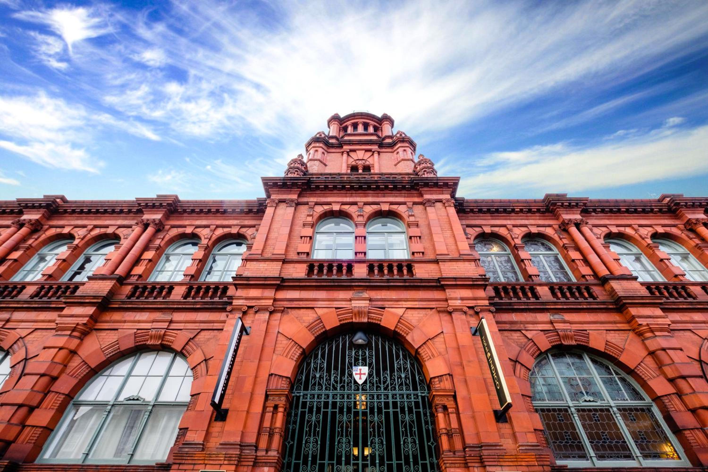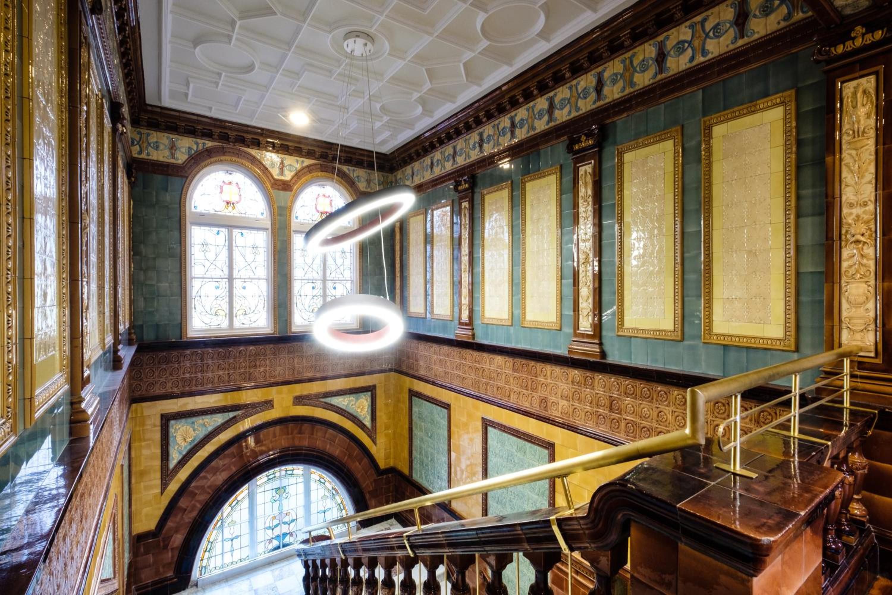 This is a majestic building with ornate fixtures such as stained glass windows and wood panelling from its history as a former council building and university building.