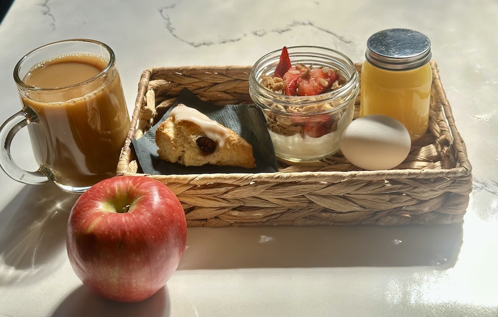 Two nights in a lovely and comfortable third floor room of a beautifully restored Victorian mansion! Breakfast was cleverly portioned out in individual jars; juice, yogurt, fruit, plus mini scones and great coffee! In the afternoon there was a choice of snacks and drinks, too.