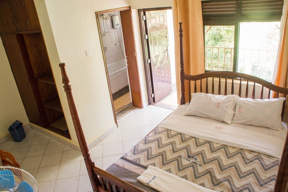 The staff spoke very poor english and some not at all and so we had to rely on our driver to communicate. Although we had booked and paid for the room on Hotels.com well in advance, they did not have our reservation and knew nothing about use. They did not even know who hotels.com was. So at first they gave us 3 rooms instead of one and then wanted to charged us more. I had to call up the hotels.com reservation on my drivers phone as their internet did not work. Finally they understood and gave us the right family room (adjoining rooms) and accepted that we had paid in advance. The rooms were nothing fancy but fine. Of course no shower curtains as we found to be the case throughout Uganda. ( probably to avoid mold). Good mosquito netting over the beds. Although we saw very few mosquitoes. We were there two nights while visiting the National Park and Falls which was a wonderful experience. The breakfast was very good.