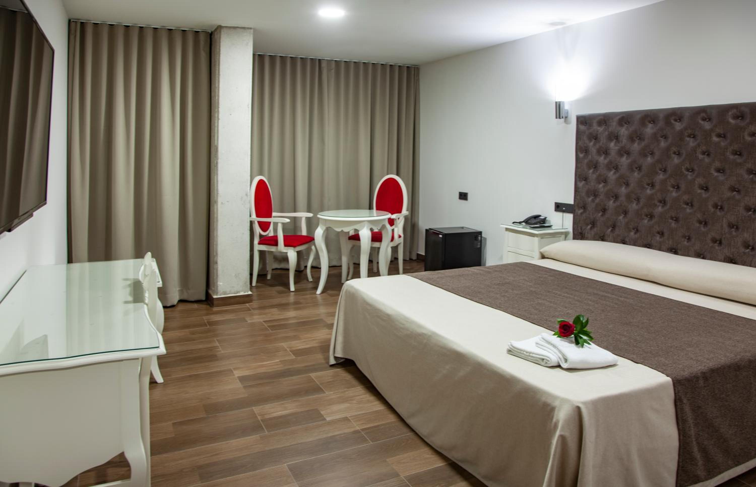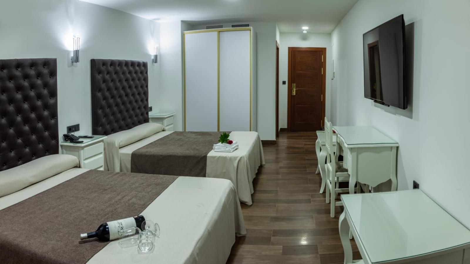 Han sido unos días estupendos. La habitación era muy amplia, con muebles funcionales pero suficientes. Destacaría el tamaño y la comodidad de las camas, dos camas dobles. El baño también era amplio, moderno y bien acondicionado. Se ubica fuera del centro del casco urbano, en la periferia del pueblo, pero apenas a 5 minutos andando, un paseo agradable. Buen wifi. Restaurante del propio hotel, muy cómodo para desayunar antes de salir, o para cenar si no te apetece salir. Buena comida y buen servicio.