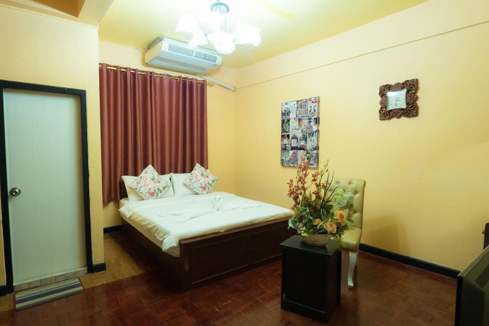 Photos are not showing how run down this place was. Paint falling from walls, old factory grade airconditioner, very dark and dusty room, old fridge, rubbish on floor etc etc. Bathroom + toilet 1square meter size - you need to stand almost on toilet bowl to get the shower. No elevator.