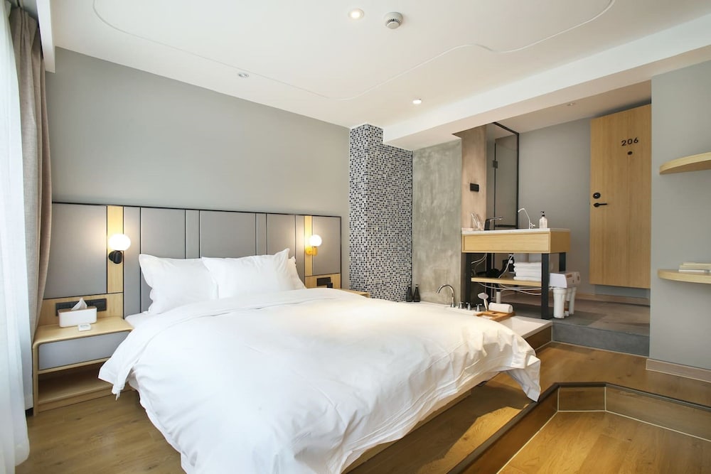 女性限定のお部屋に4泊しました。清潔で可愛いホテルです。写真ではわからなかったのですが、ベッドの脇にバスタブが埋まっています。一人でしたので問題ありませんでしたが、ベッドとシャワールームが離れていた方が良い場合は、シティスイートかデザインスタジオを選ぶと良いそうです。(聞いたら見せてくれました。脱衣所はありません。)水圧は弱いですが排水は