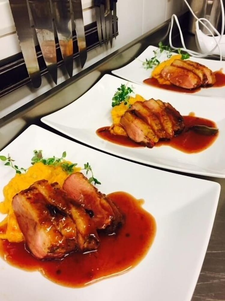 Vi åt en superb middag på restaurangen och fick ta med hunden in i lobbyn där vi även åt frukosten.