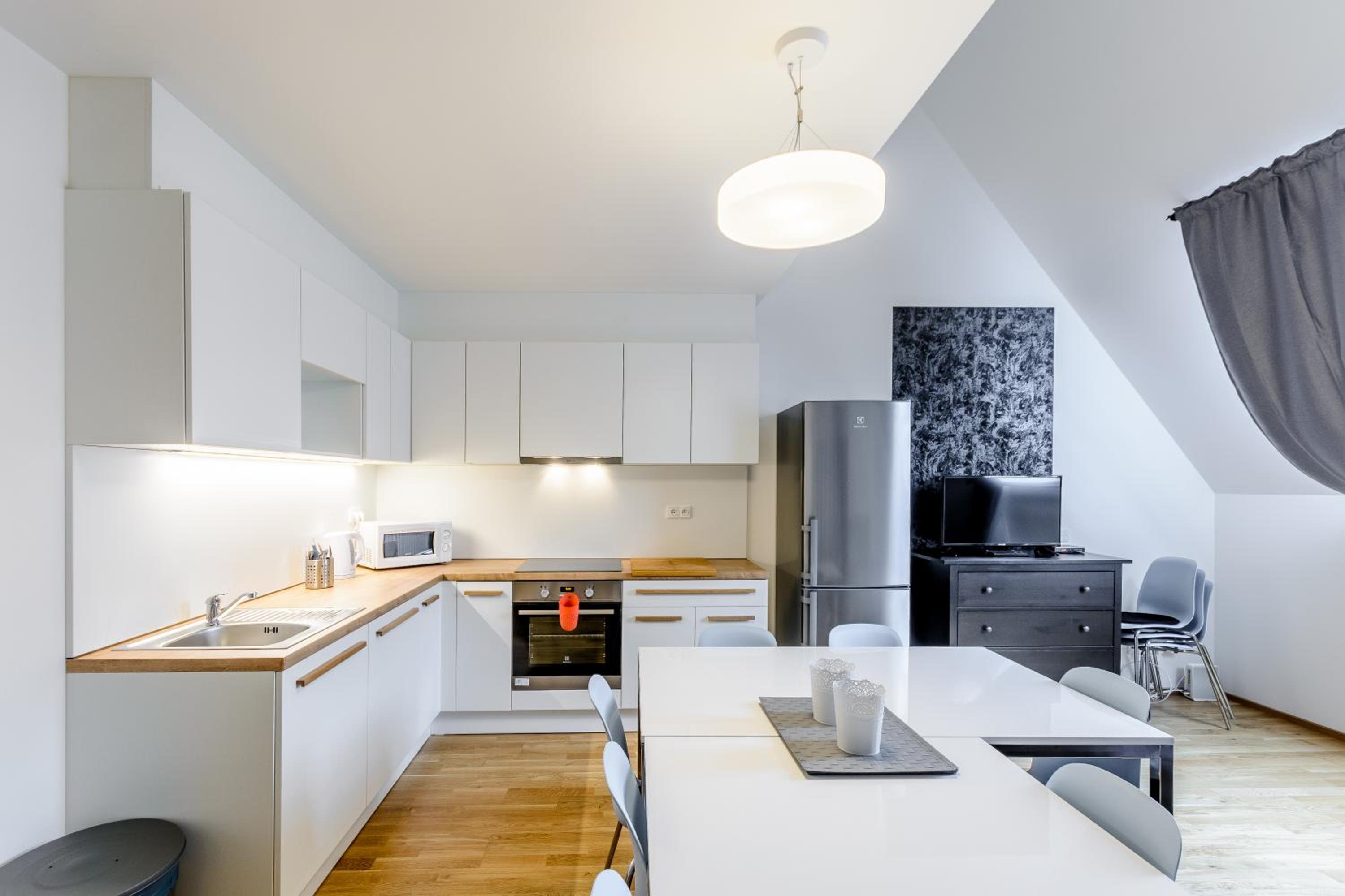 Riverside SPIRIT offers a luxurious stay in Prague, just a stone's throw away from popular attractions like Vyšehrad and Prague Astronomical Clock. The elegantly designed units feature a fully equipped kitchen, a cozy seating area, and a modern bathroom stocked with complimentary toiletries.