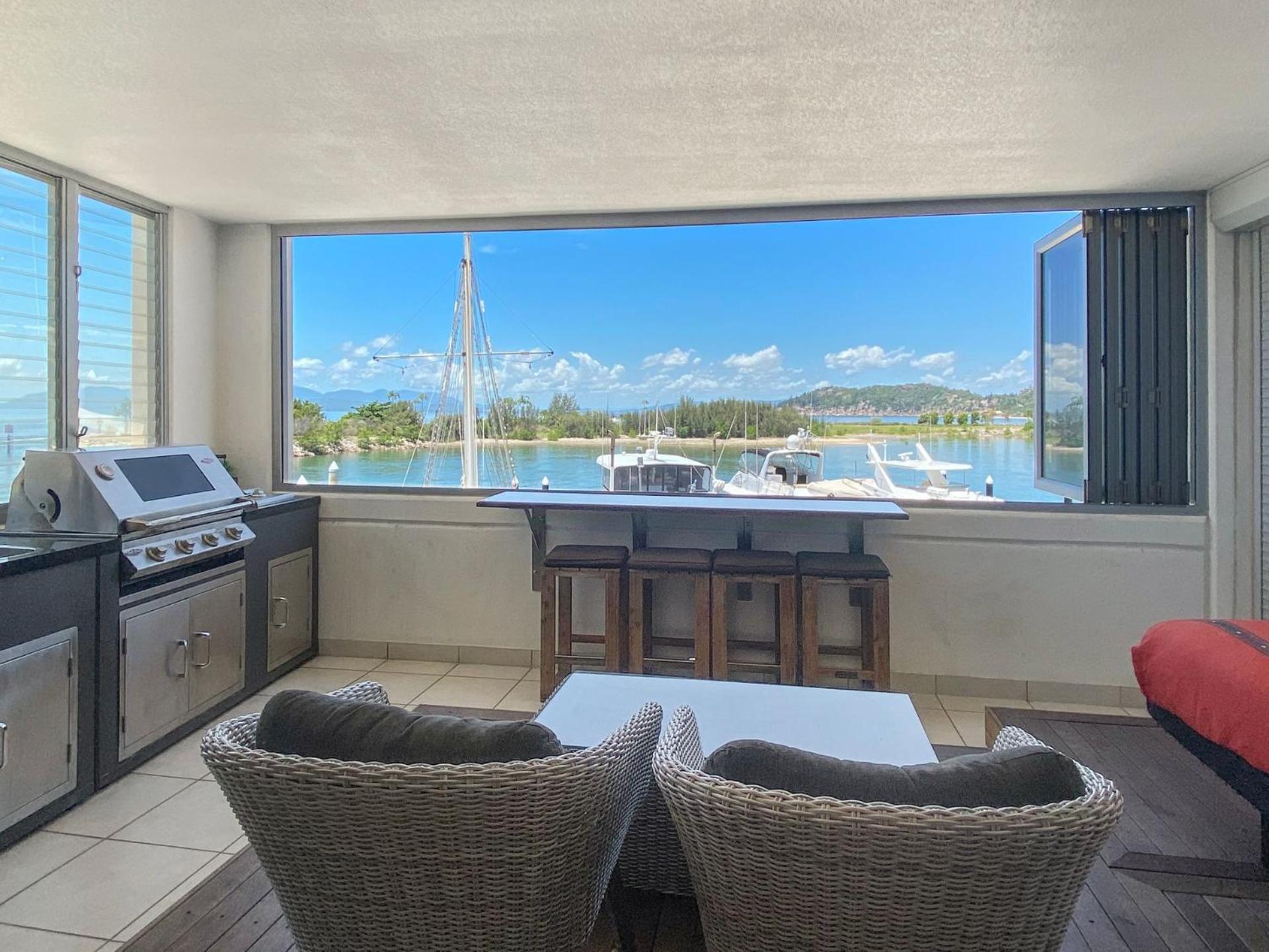 Apartment 1271 offers a cozy studio layout with a queen size bed, ensuite with a bath, and a kitchenette. Indulge in uninterrupted water views of the Marina and Coral Sea from the lounge or balcony. The added bonus of a Weber BBQ on the balcony enhances your experience of the picturesque surroundings.
