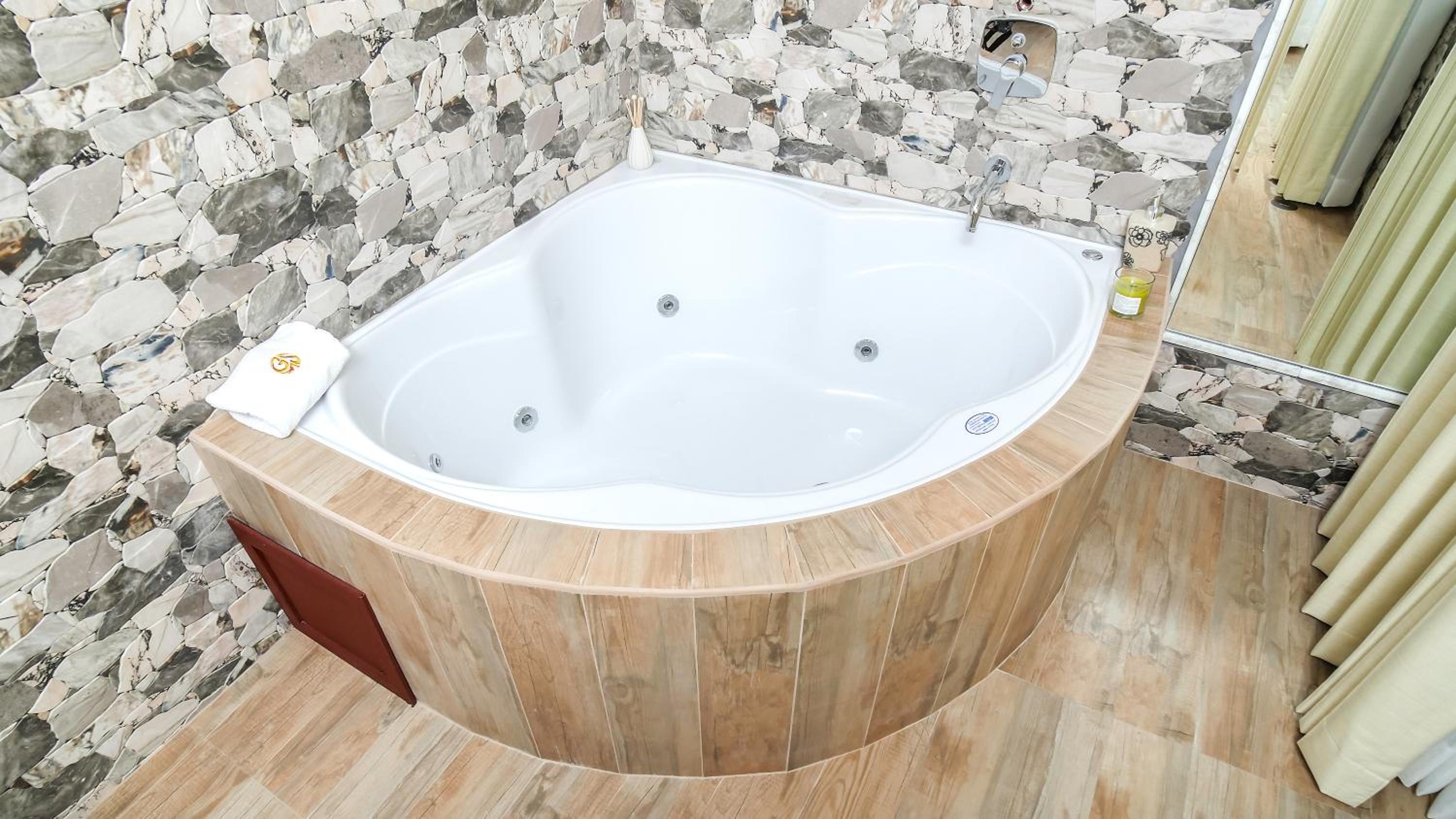 La chambre était spacieuse, comfortable. On avait un balcon qui donnait sur la forêt et la montagne sans vis-à-vis. Et le top : un jacuzzi dans la salle de bain.