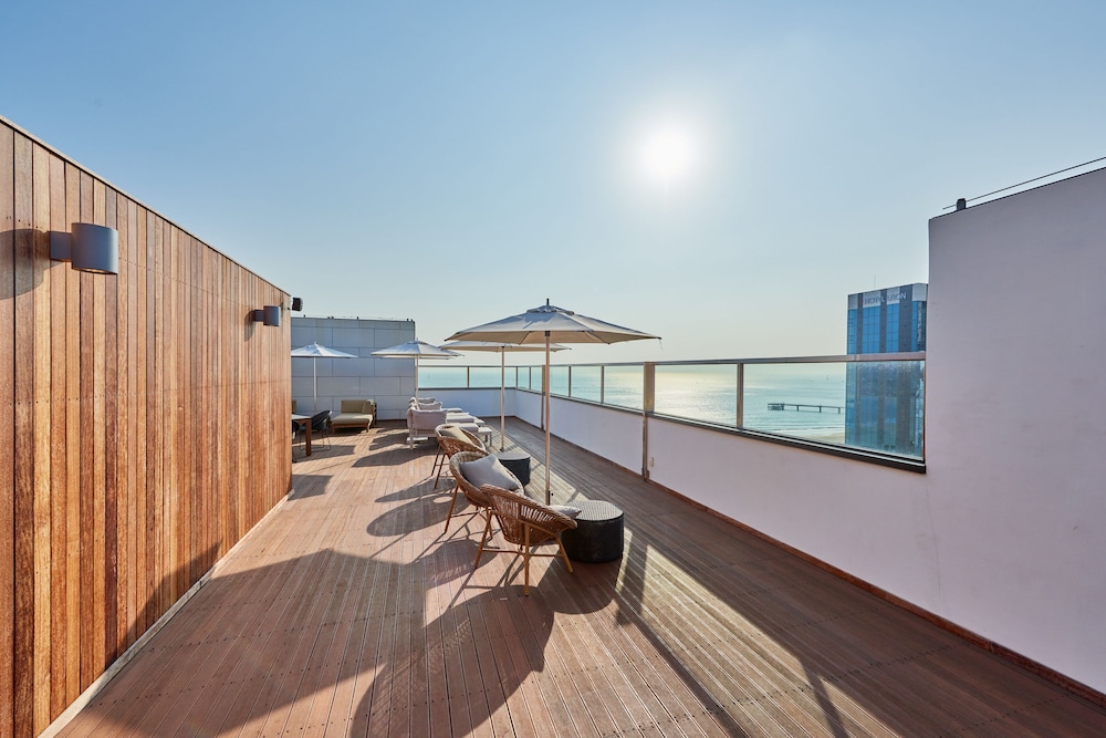 This hotel is a hard 2 stars. The positives about this hotel were the location to the beach, the bathroom was pretty nice, and the price is very cheap. The negatives of this hotel are as follows. The numbers had fallen off the doors, the flooring is concrete covered in peel and stick tiles, the bed was hard and creaky, there was so much dust under the tables and on the headboard, a charger glued on the side table that was frayed and broken, a giant dent in the wall that was made from someone slamming the table into the wall, pealing wallpaper, and they don’t make your bed or give you clean towels between nights. The pictures are for the deluxe ocean view and all the other rooms are different. They show a rooftop, but there is no way to access it. The coffee shop on the front is most likely how you access the roof, but it’s not in business. If you are only sleeping and need something cheap, it’s ok, but honestly you might not sleep well because the AC is loud and the bed is so uncomfortable. I mean at least it didn’t smell of smoke and have bugs. If you have dust allergies, don’t stay here. We ended up leaving after 1 night, even though we booked 2, and moving to an Airbnb.