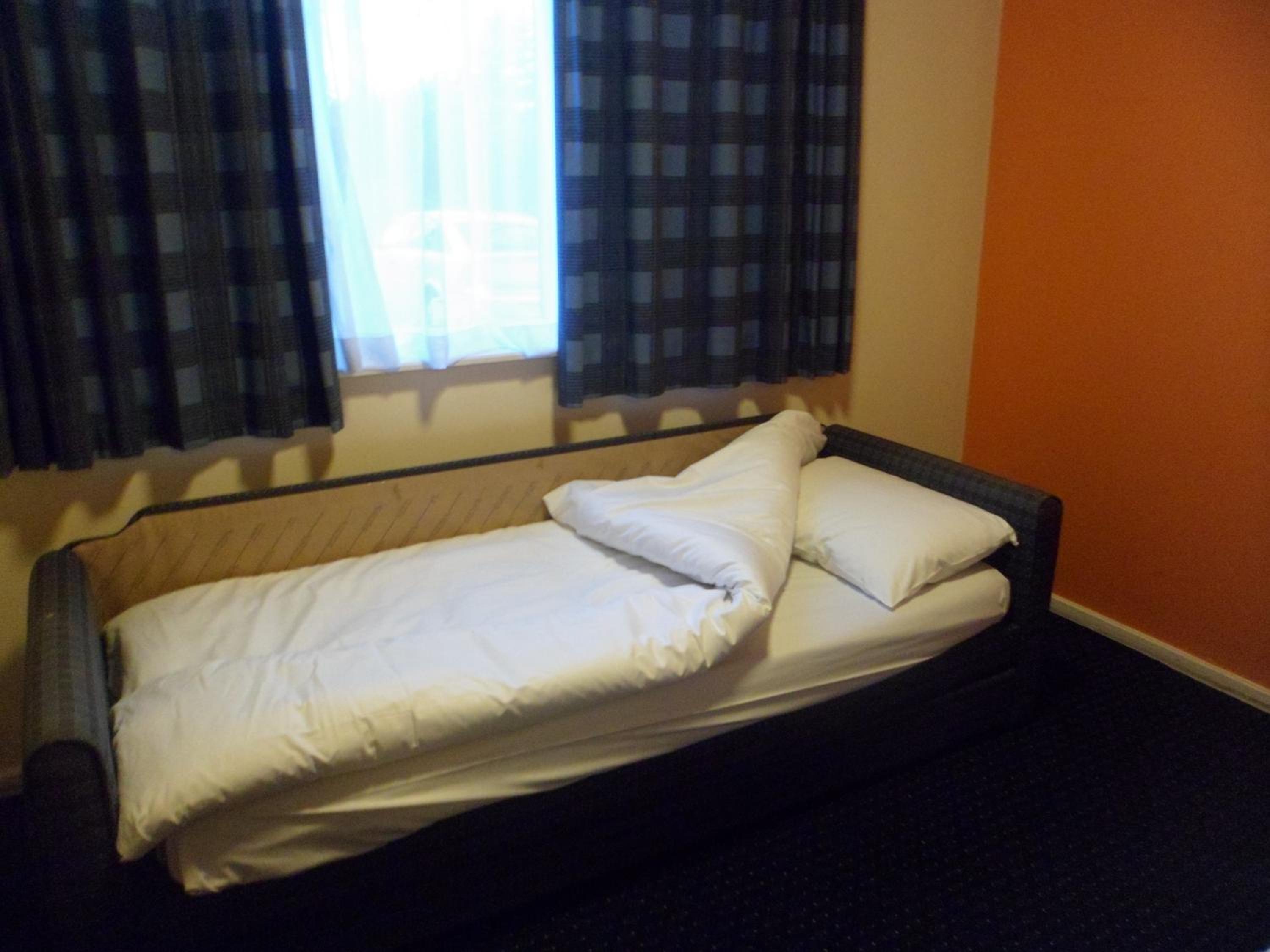 My room overlooked a litter strewn car park, the walls in the room had holes in which hadn't been filled, the headboard had one side shelf missing, the bottom of the bath was brown, the towel rail was practically hanging off the wall, the carpet around the edges was dirty, the walls had been scrapped and not been painted and one window didn't even have a handle. Also, I emailed the hotel twice about the nearest bus stop but never got a reply.