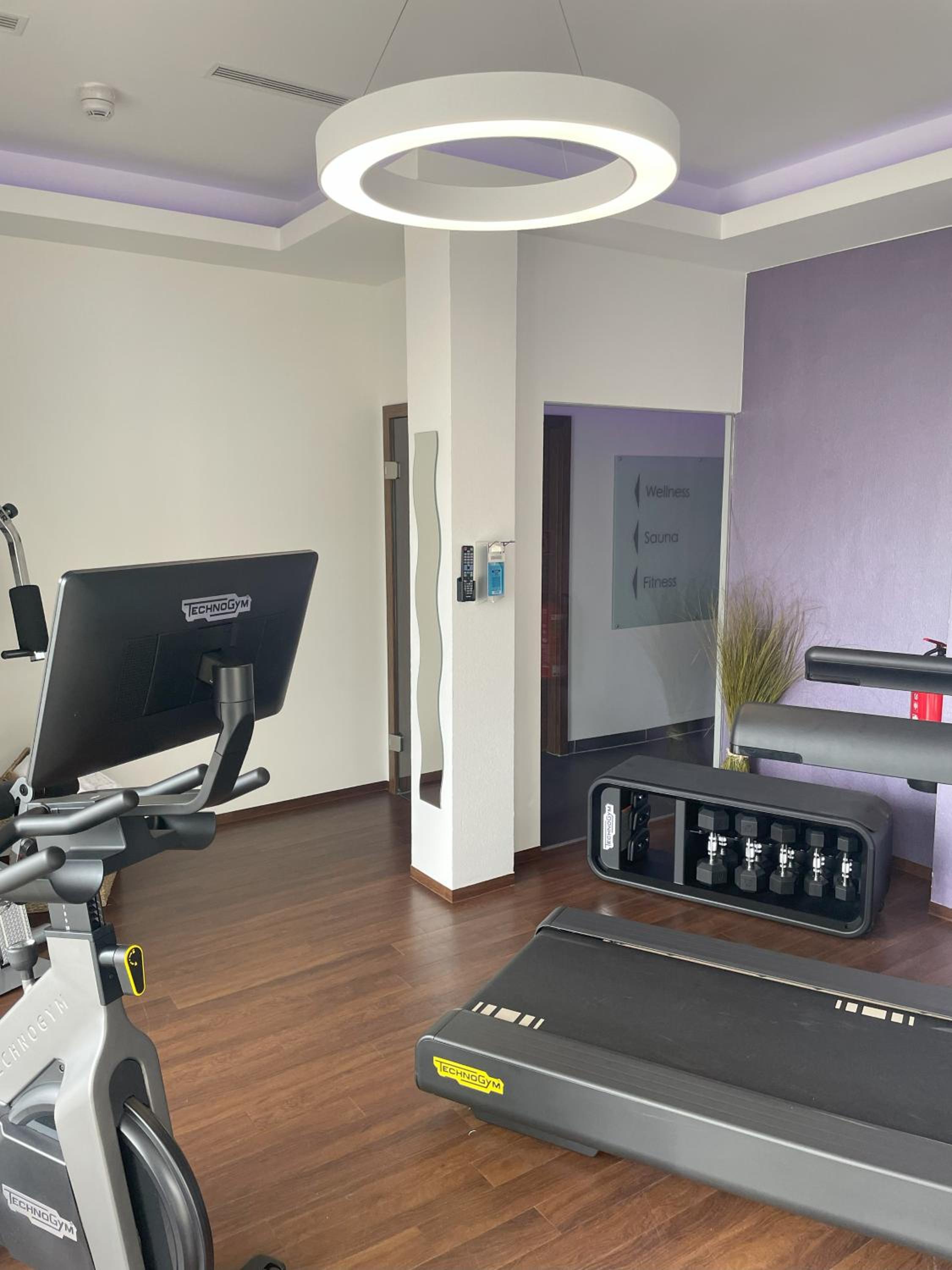 Fitnessraum besteht aus 2 Cardio geräten, einem billigen Kabelturm und hanteln bis 10kg…