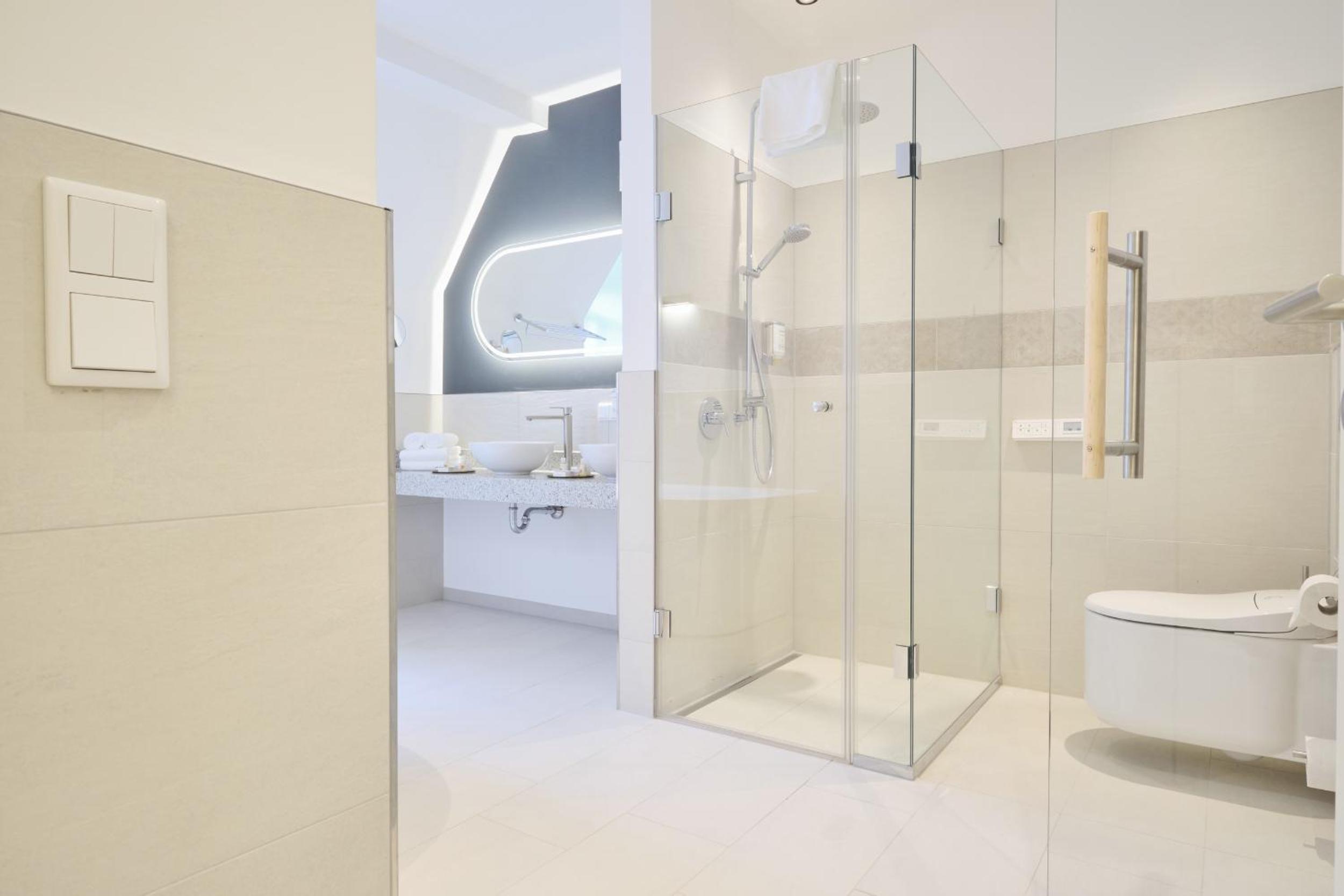 Keine Ablage im Badezimmer. Ausgang aus der Dusche sehr schwer aufgrund der Größe.