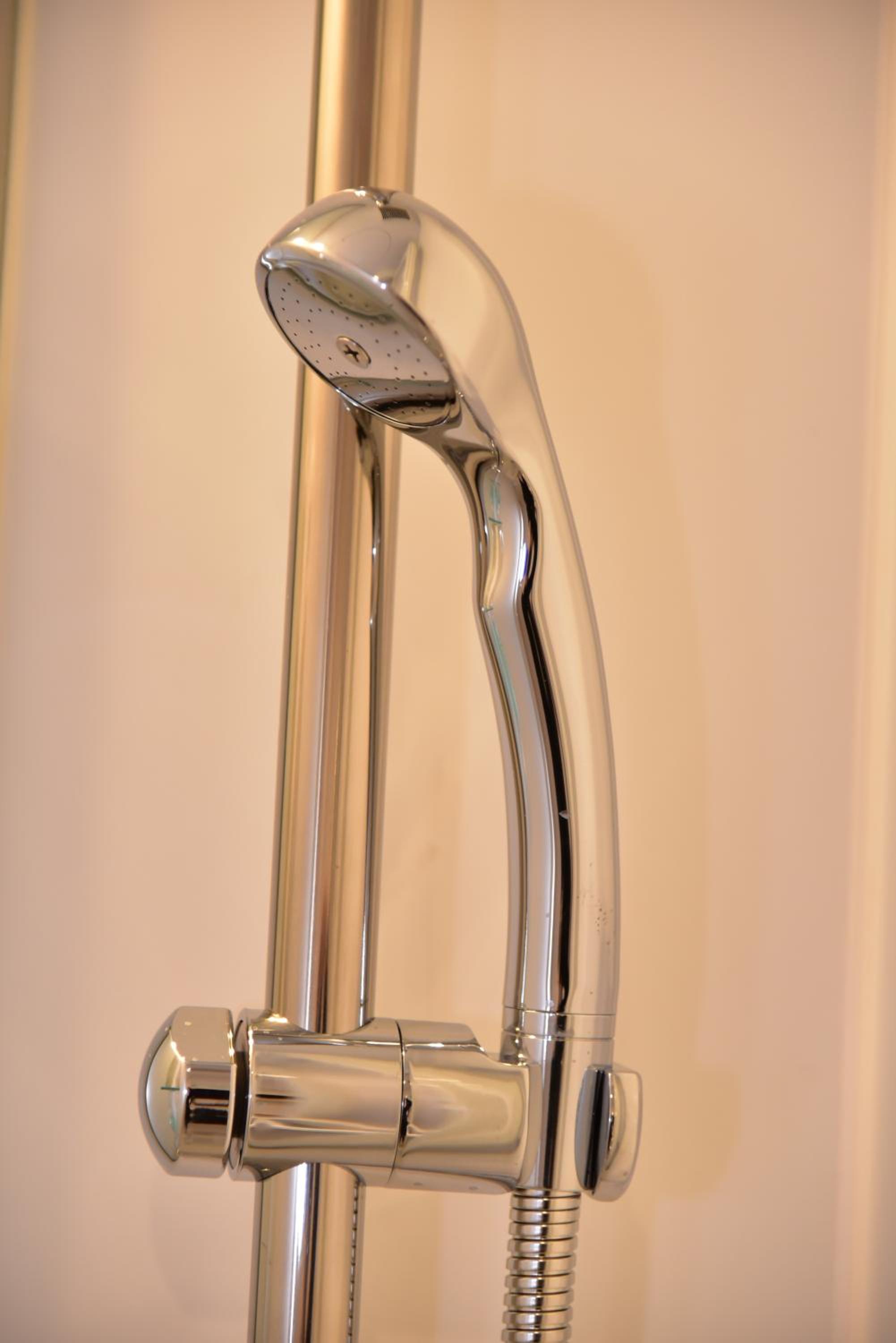 The shower room is rather small, and it would be helpful to have clothes hooks installed inside, as the only available space for clothing is currently the shelf unit.