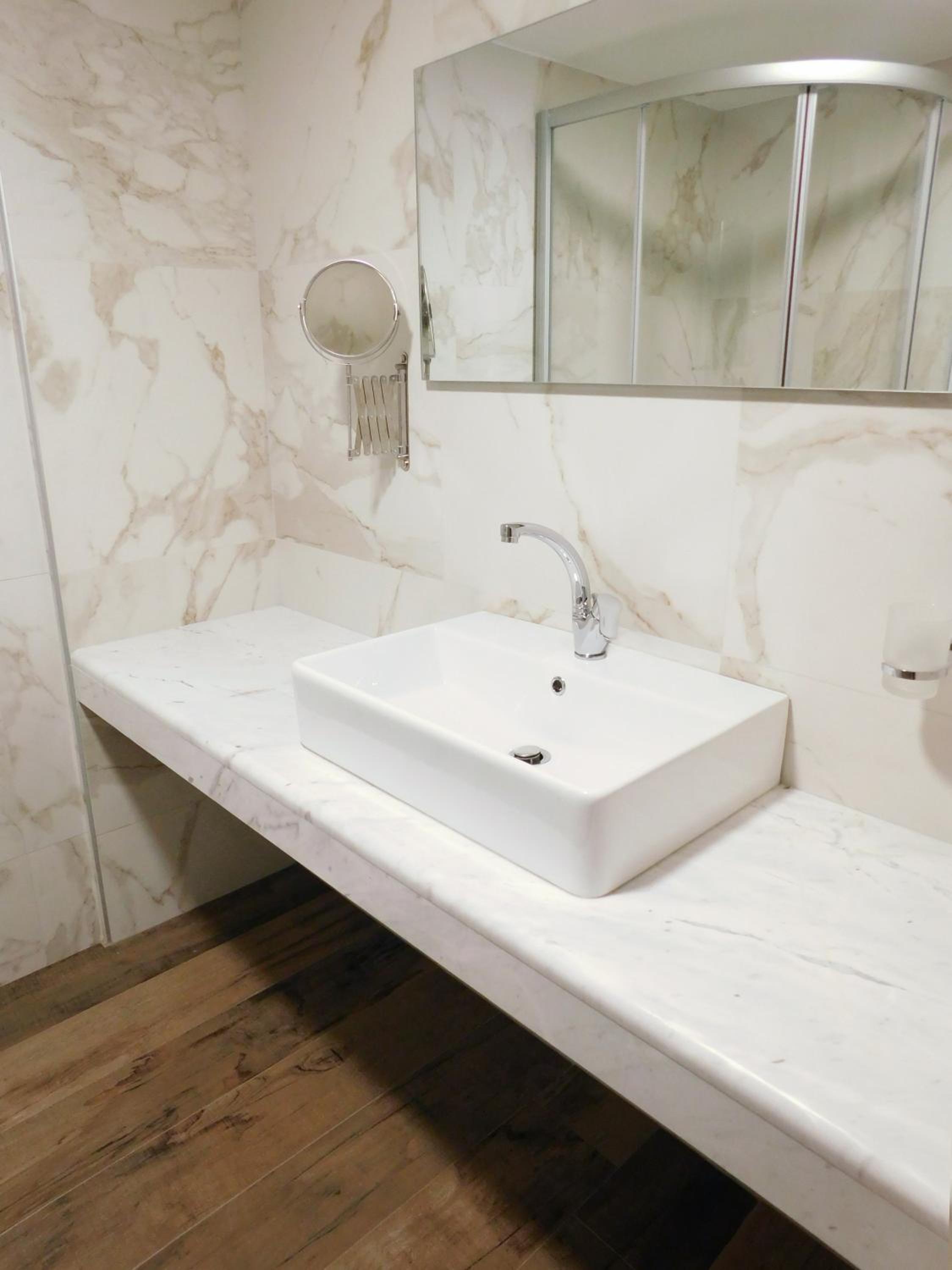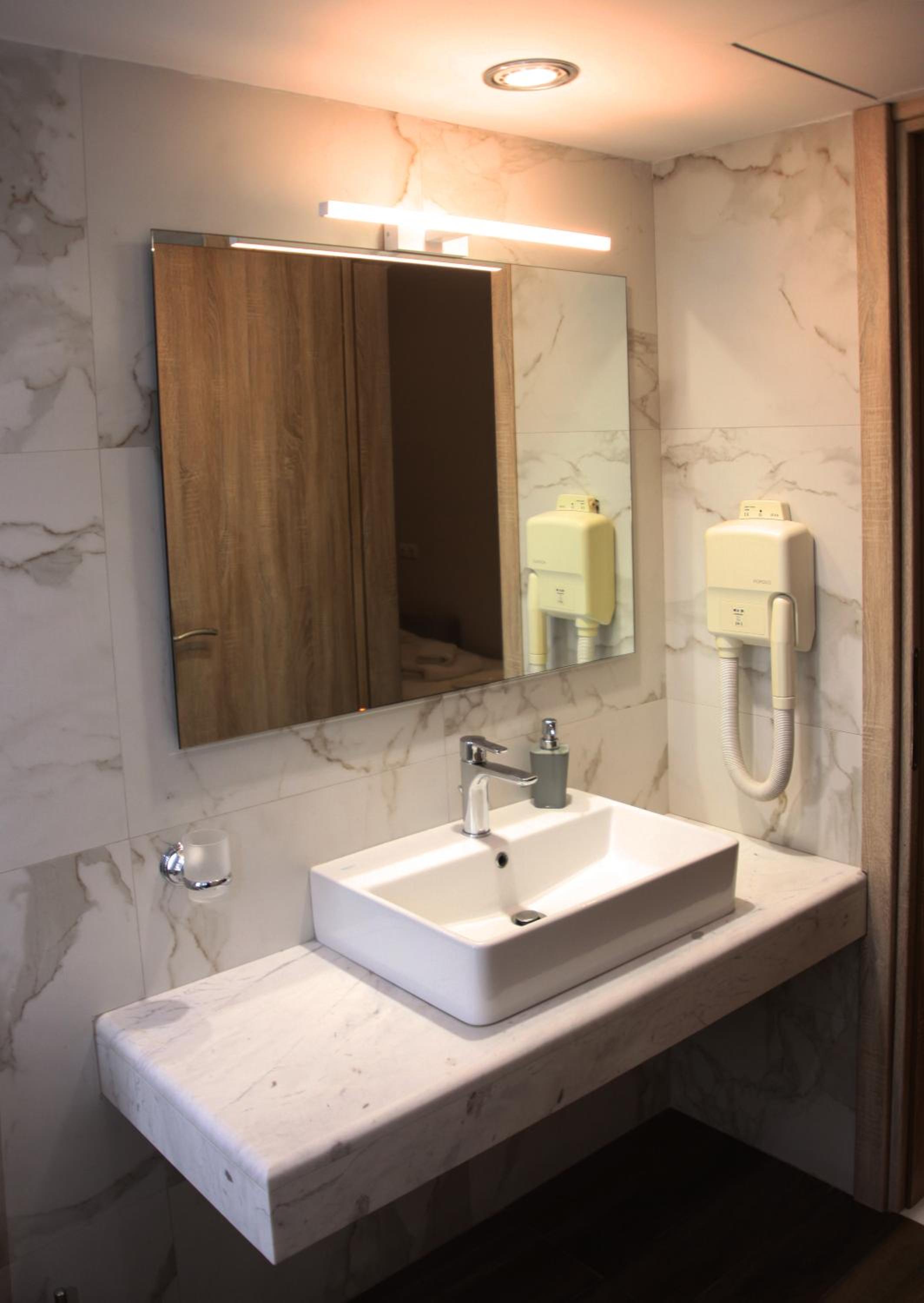 The bathroom faucet is designed in a way that causes water to splash onto the floor when opened more than halfway. Hopefully, this issue does not apply to all rooms.