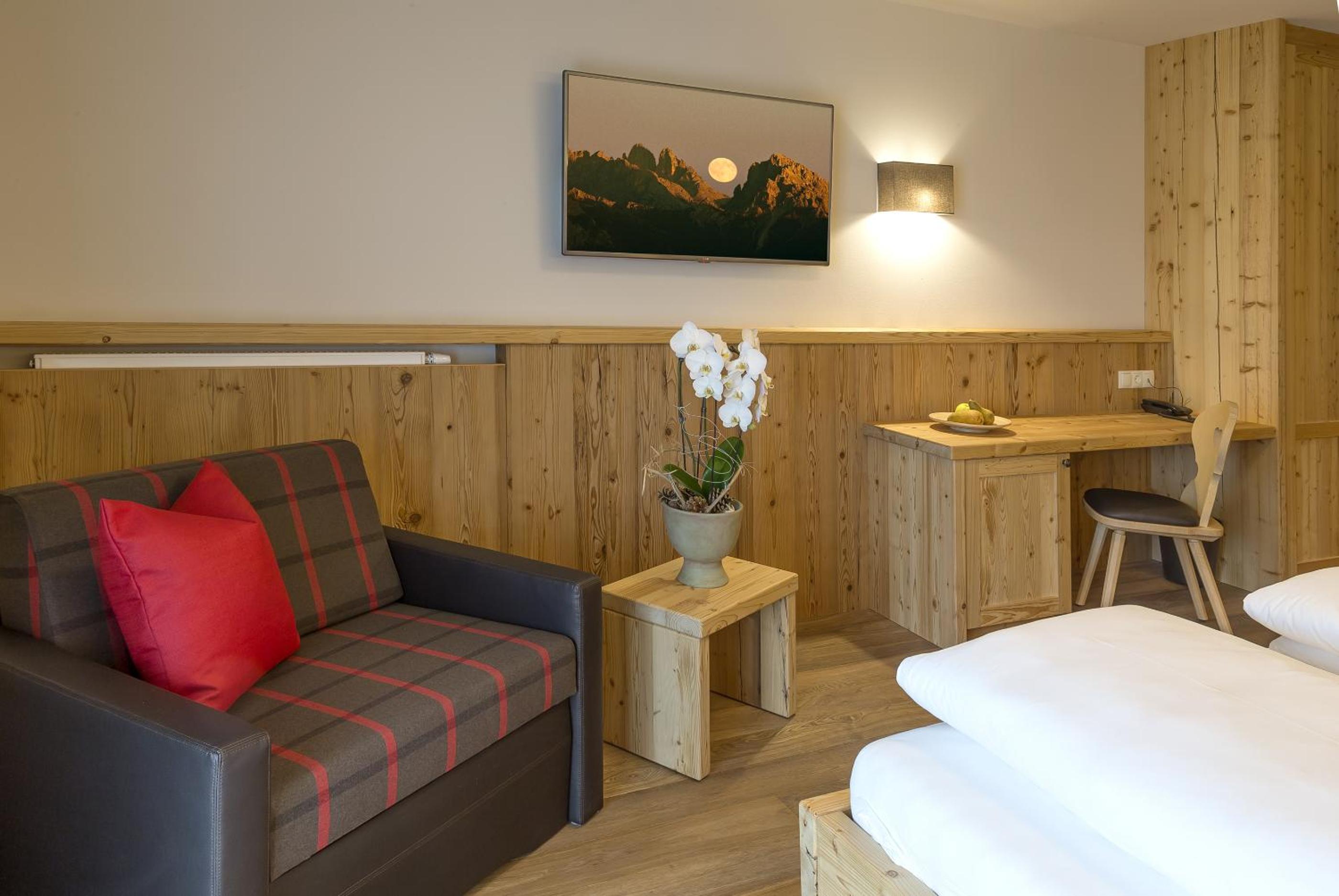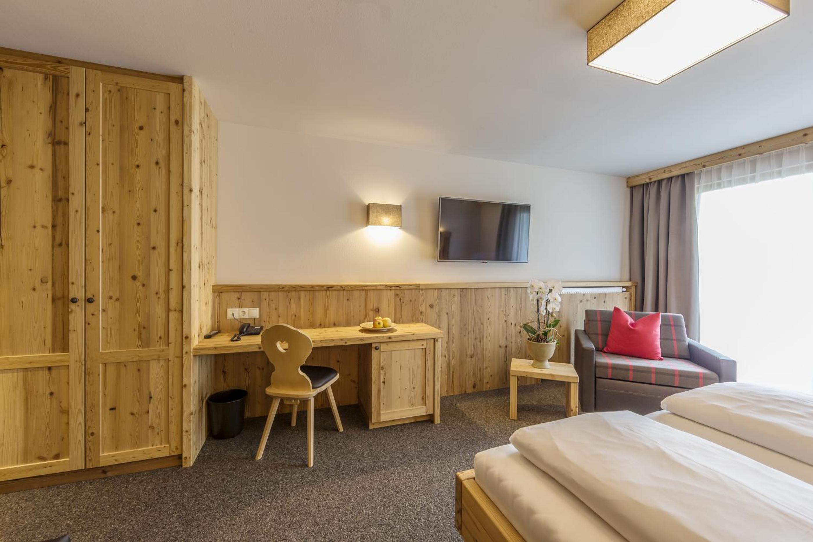 Experience comfort in our cozy Alpine-style rooms with picturesque garden or mountain views. Enjoy modern amenities like free Wi-Fi, LCD satellite TV, and private bathrooms.