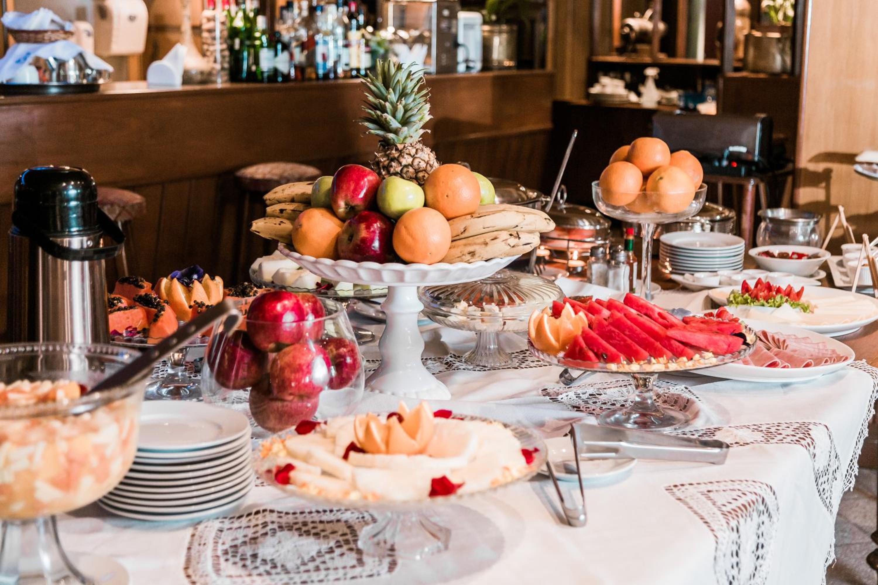 Delicious Breakfast and Elegant Dining: Start your day right with a delicious American breakfast featuring tropical fruits and fresh bread. Indulge in exquisite dining at our stylish restaurant adorned with elegant ceiling decorations and wall mouldings.