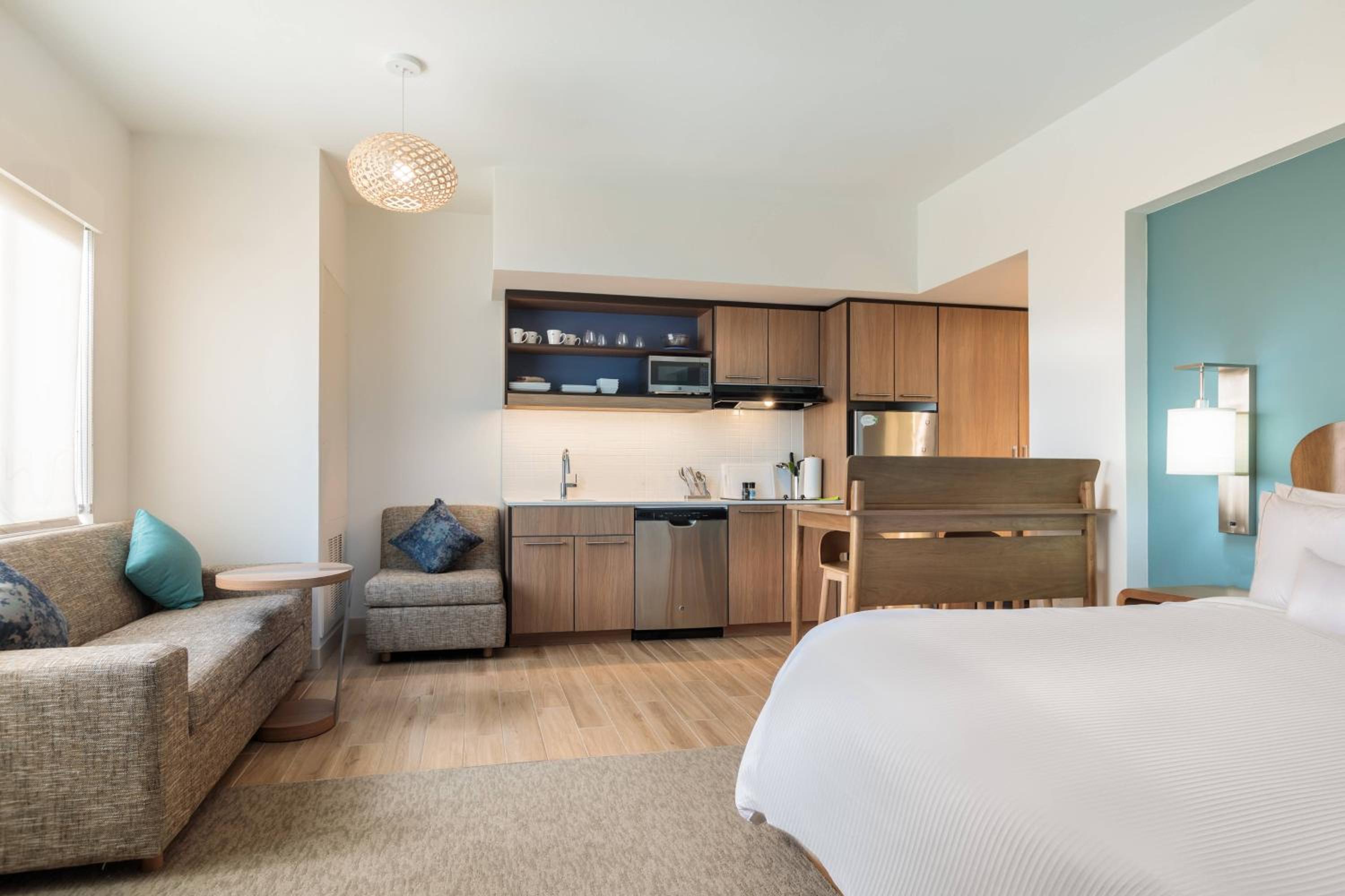This hotel is fabulous! Check in was a breeze! They did put us in a room by the elevator but moved us without any problem. The one bedroom room was clean, and spacious. This has got to be the quietest hotel I've ever been in. The air conditioner worked great, maybe even too good lol. The bed and pillows very comfortable. I would have loved an extra blanket in the room. The couch was rather uncomfortable due to it being a sleeper, but it was fine.