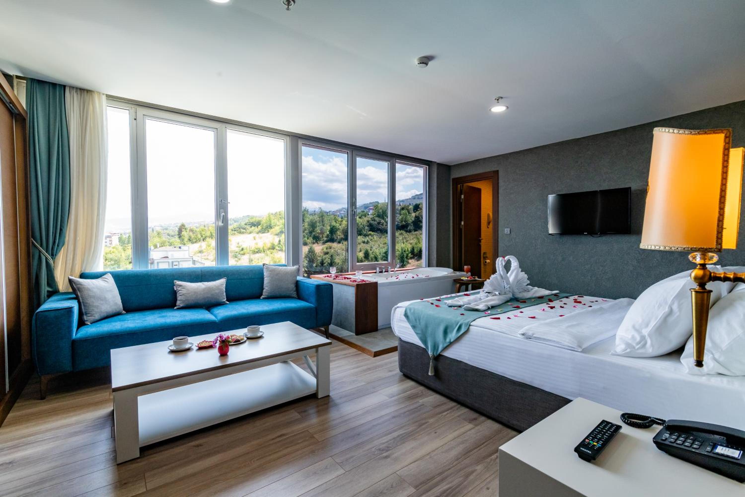 The rooms at Tilya Resort Hotel feature modern amenities including an LCD TV, minibar, safe box, and work desk. The contemporary bathrooms offer a choice between a shower or a relaxing bath tub, with the option to enjoy sea or nature views from the comfort of your room.